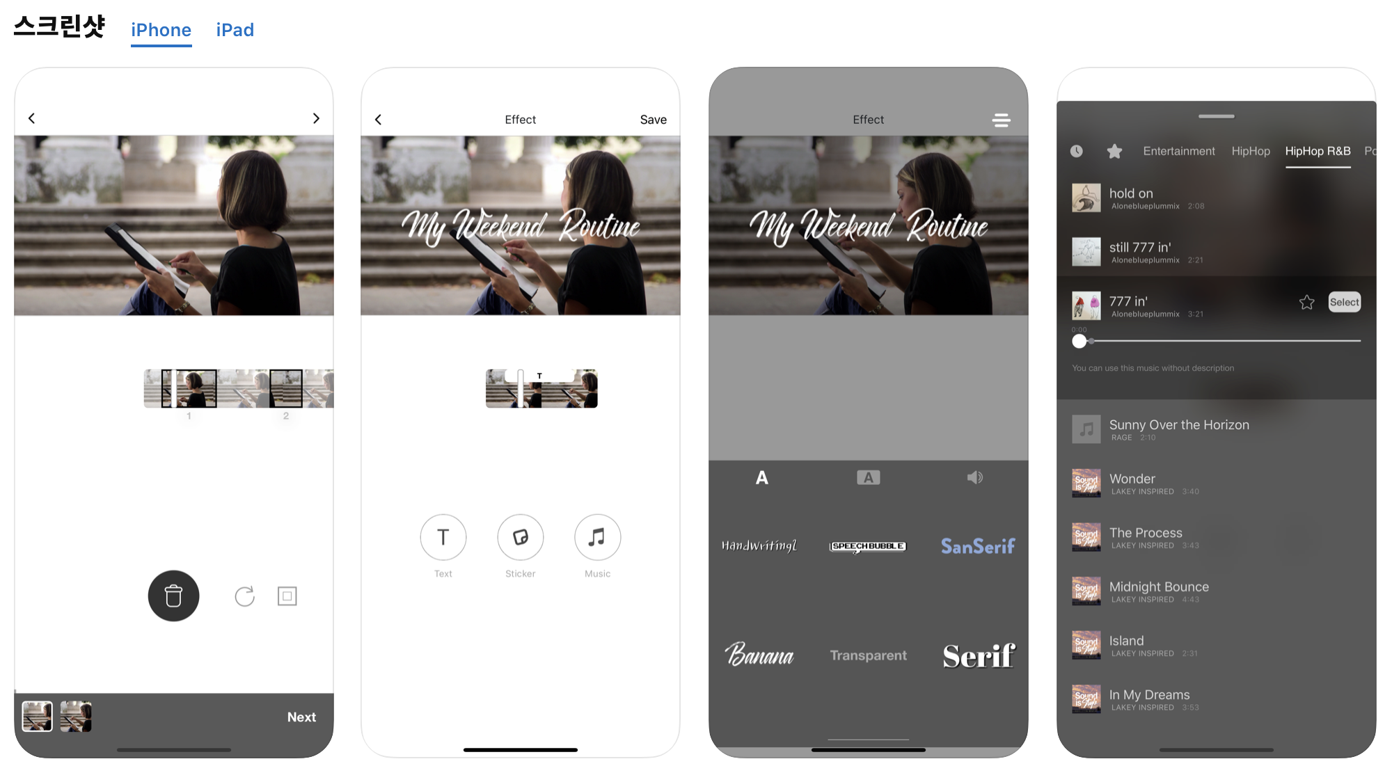가장 추천하는 어플입니다. 조작이 간편해서 배우기도 쉽습니다.(블로그 내 블로 강좌가 있습니다) 앱 내 유료 구매를 통해 더 많은 음악과 효과를 사용할 수 있지만, 처음에는 무료로 사용하셔도 충분합니다. 심지어 무료 사용자에게도 워터마크가 생기지 않기 때문에 더욱 부담 없이 사용할 수 있는 어플입니다. 커트 편집, 배경음악, 효과, 자막 등 직관적인 사용법으로 익히기도 쉽습니다.