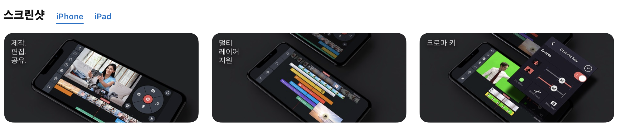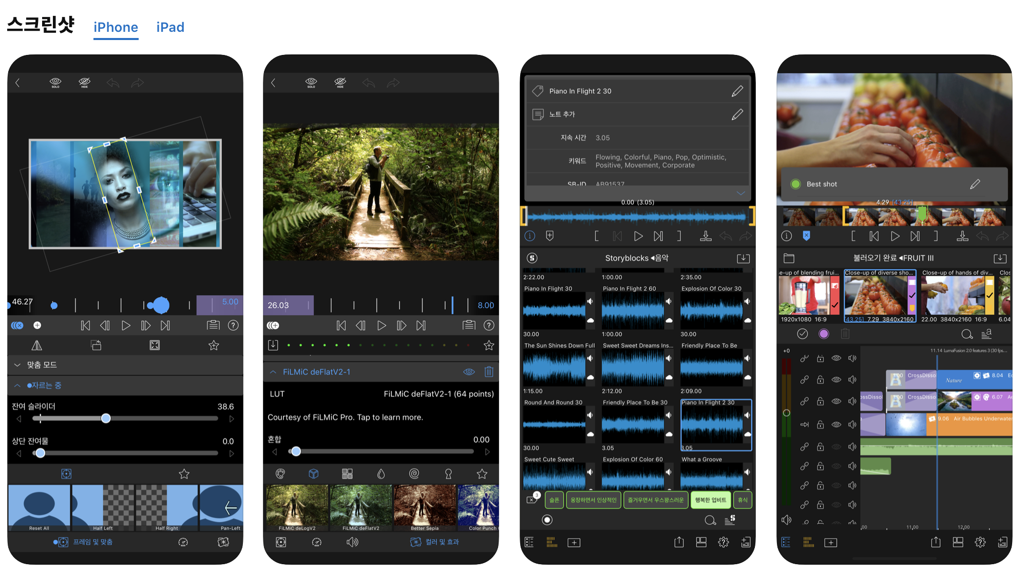 영상편집 어플 중에 단연 최고의 성능을 자랑하는 어플입니다. 맥북에서 사용하는 전문 영상편집 프로그램인 파이널 컷에 못지않은 뛰어난 기능들을 제공합니다. 가장 먼저 소개하고 싶은 어플이었지만, 37,000원이라는 다소 부담스러운 금액이기에 무료 편집 어플을 이용하여 편집에 익숙해진 후에 구매하셔도 충분합니다.