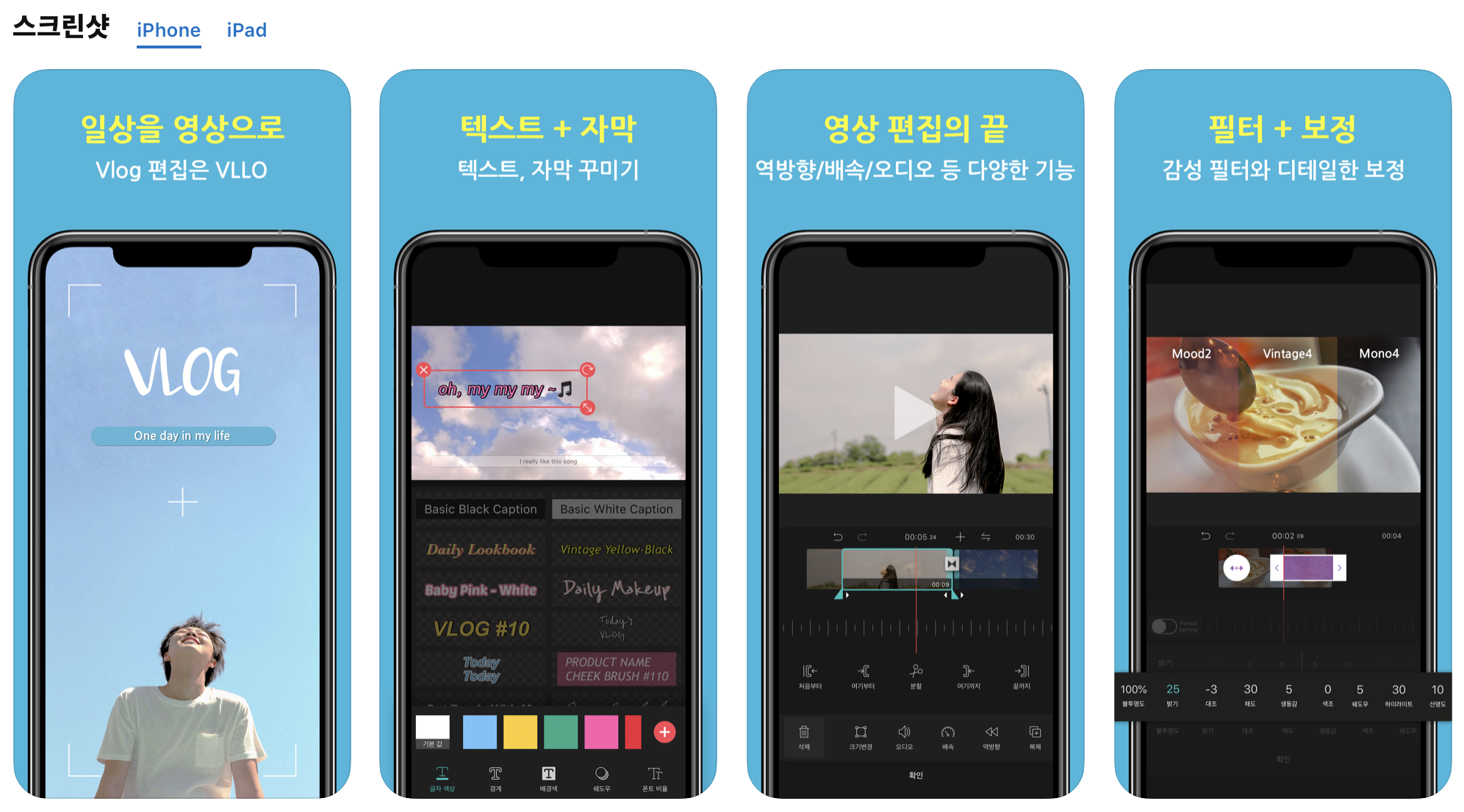 브이로그 전문 편집 어플입니다. 템플릿부터 자막 등 브이로그에 어울리는 요소들로만 이루어져 있습니다. 어플 자체에도 업로드를 하고 공유할 수 있어서 다른 사람들의 브이로그도 참고할 수 있습니다. 특히 젊은 여성들의 감성을 자극할만한 세련된 디자인들이 많아 저도 몇 번이나 사용을 했습니다. 다만 개인적으로 사용해본 결과 직관적이지 않은 사용법 때문에 다소 편집에 불편한 부분들이 있었습니다. 감각적인 디자인을 원하는 분들에게 추천하는 어플입니다.