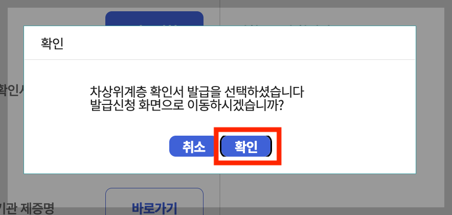 ▼ 발급 선택이 맞는지 확인 메세지가 나옵니다. 여기서 [확인]을 누릅니다.