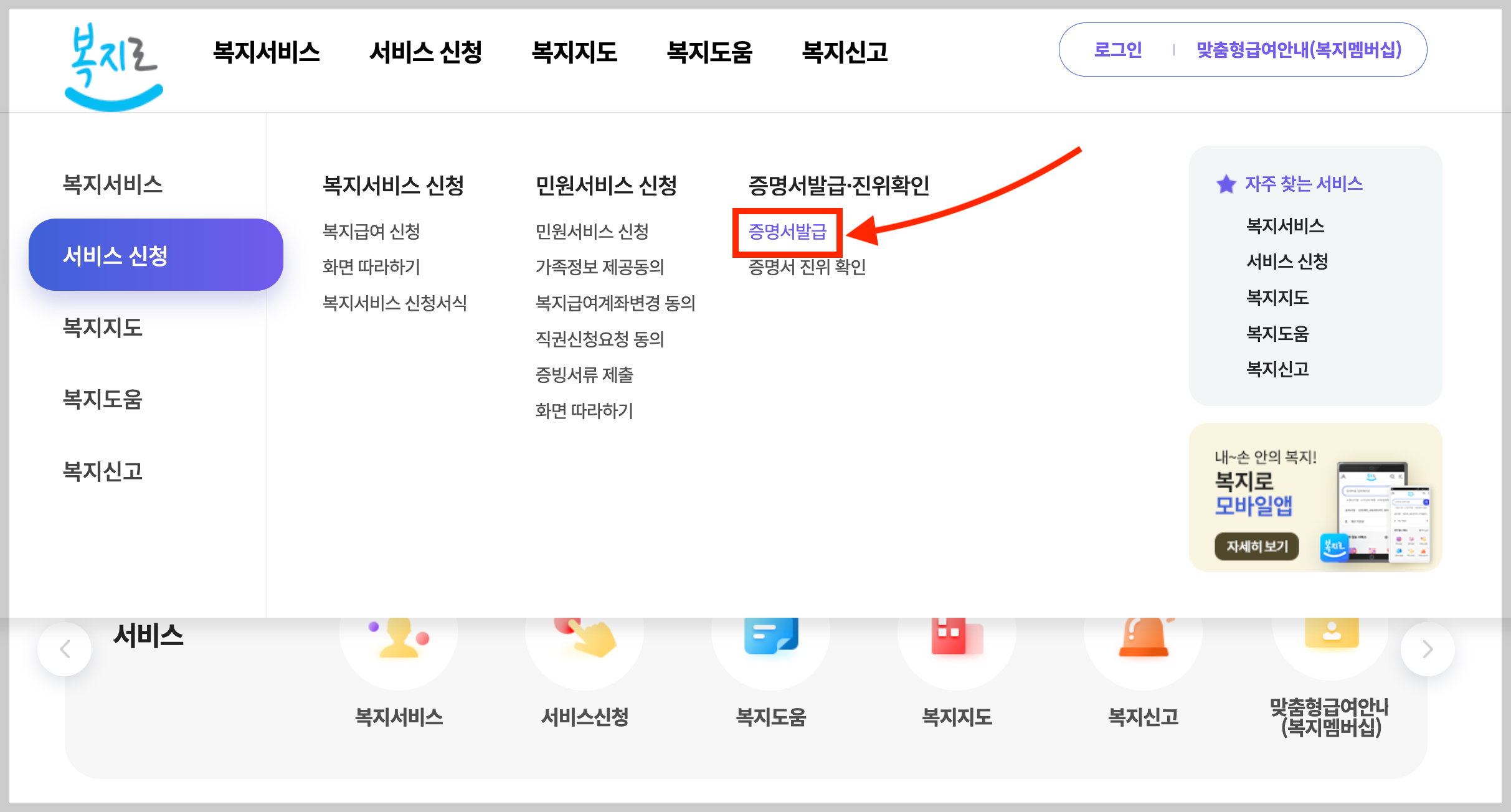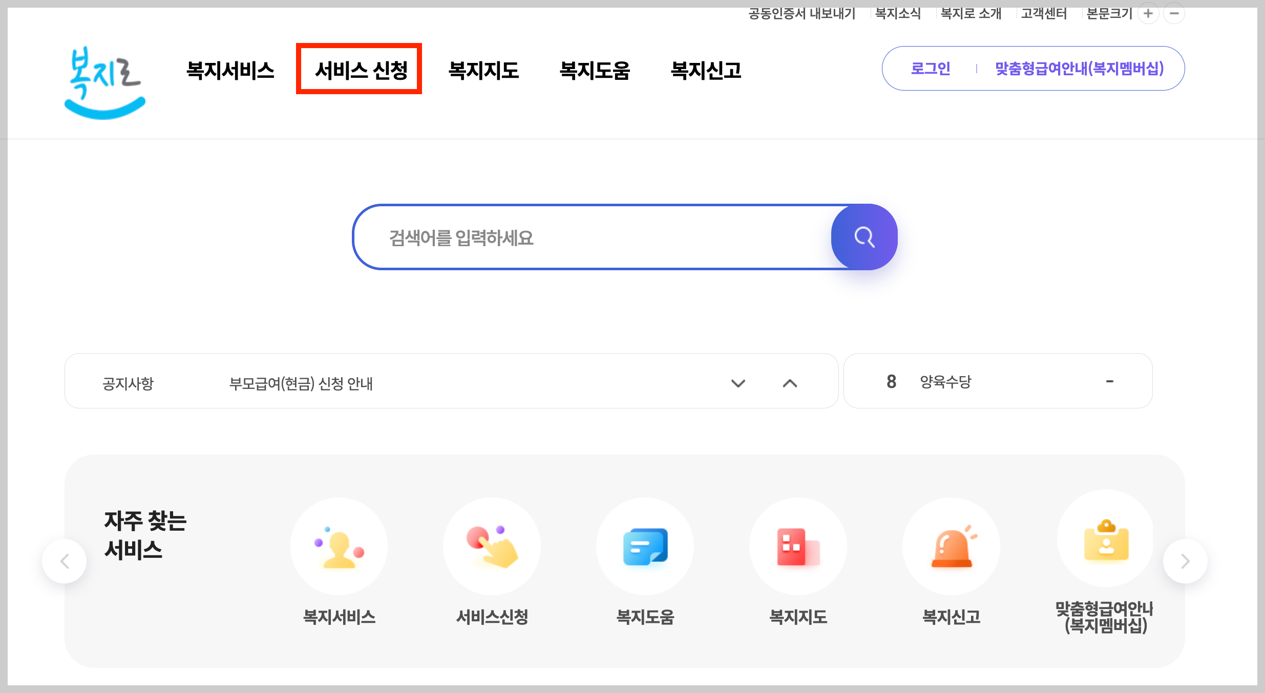 ▼ 복지로 홈페이지에 접속 한 뒤에 상단에 있는 [서비스 신청]을 누릅니다.
