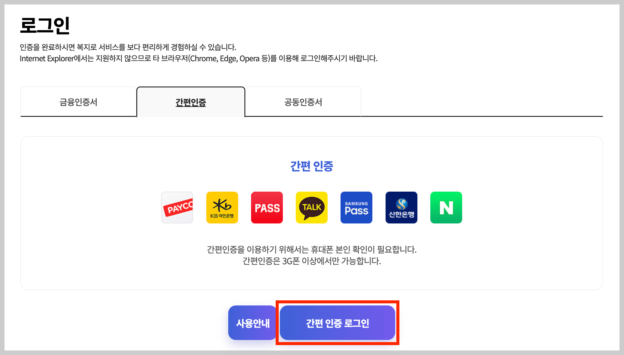 ▼ 로그인을 해주어야 하는데 회원가입 없이도 이용할 수 있습니다. 본인이 편한 간편인증을 해줍니다.