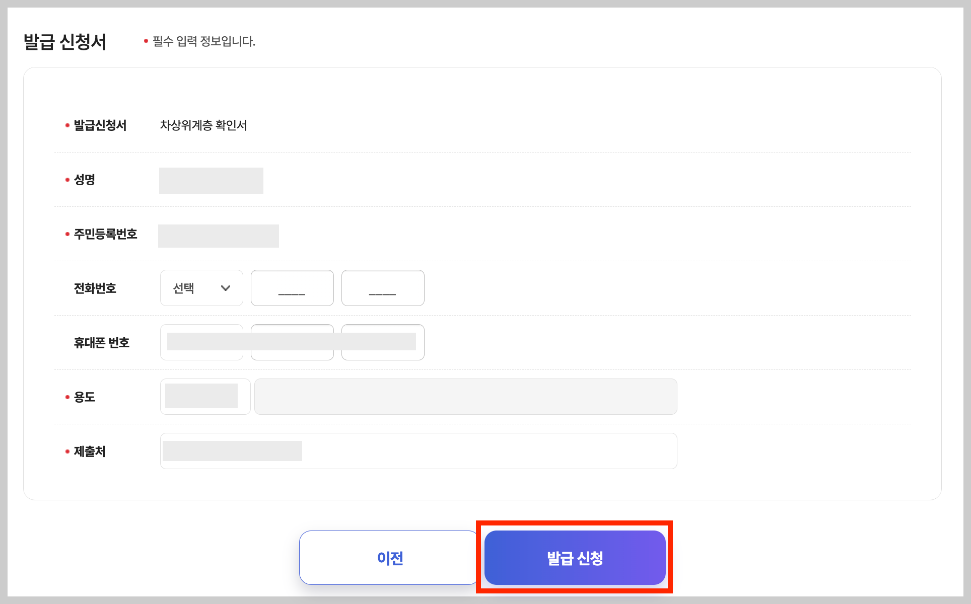 ▼ 마지막으로 발급 신청서에 개인 정보를 추가로 입력합니다. 휴대폰 번호, 용도, 제출처를 작성한 뒤 [발급 신청] 버튼을 누르면됩니다.