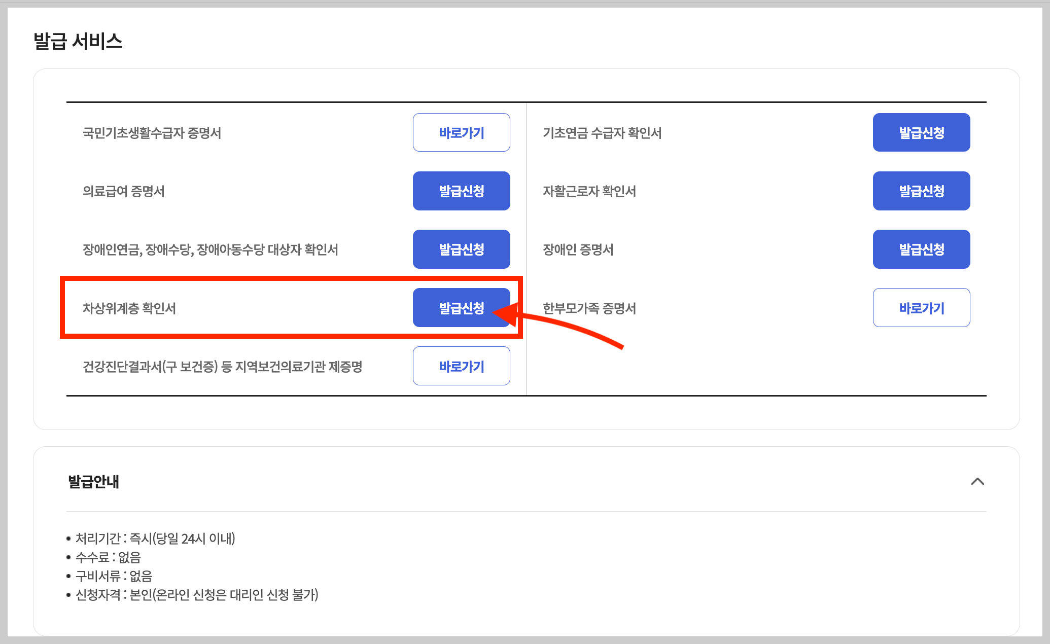 ▼ 인증이 완료되면 발급 서비스 페이지로 이동합니다. 여기서 [차상위계층 확인서] 오른쪽에 있는 [발급 신청] 버튼을 누릅니다.
