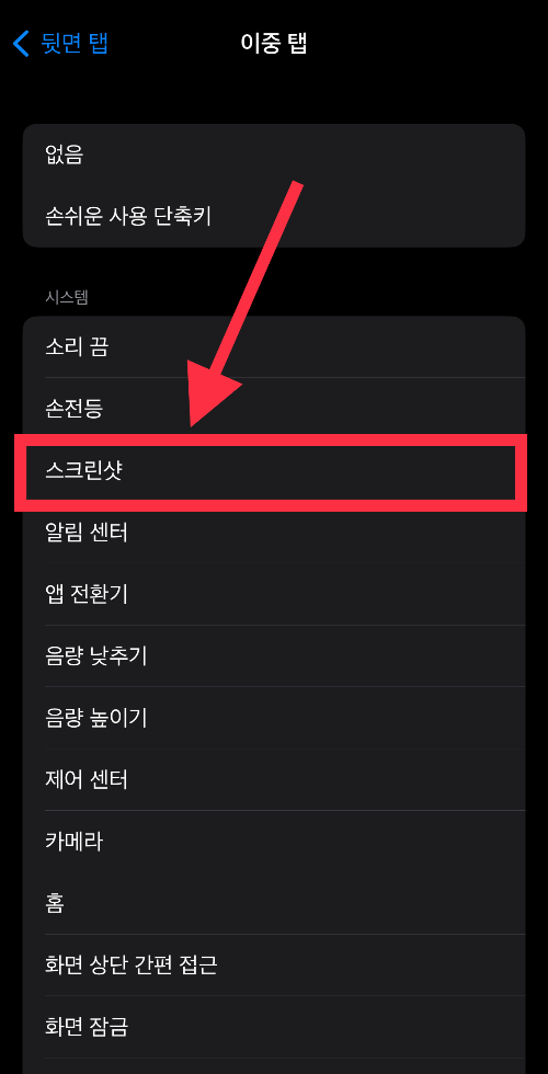 ▼ 이중 탭을 했을 때 설정할 수 있는 기능들이 여러 개가 있는데, 이 중에 [스크린 샷]을 선택한다.