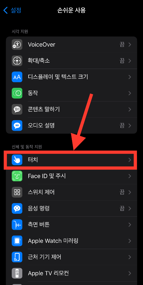 ▼ 손쉬운 사용에 있는 신체 및 동작 지원에서 [터치]를 선택한다.