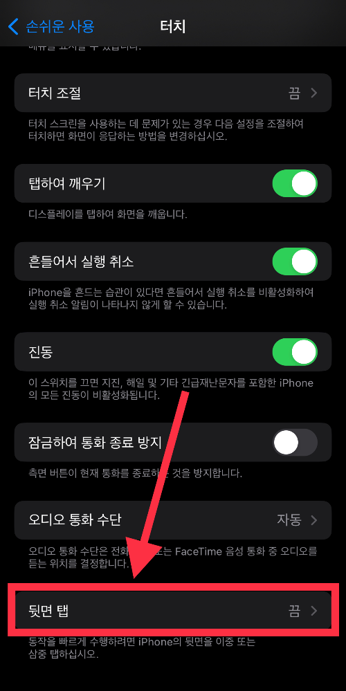 ▼ 터치 메뉴 중에 가장 아래로 내려보면 [뒷면 탭] 메뉴가 있다. 이 메뉴를 선택한다.
