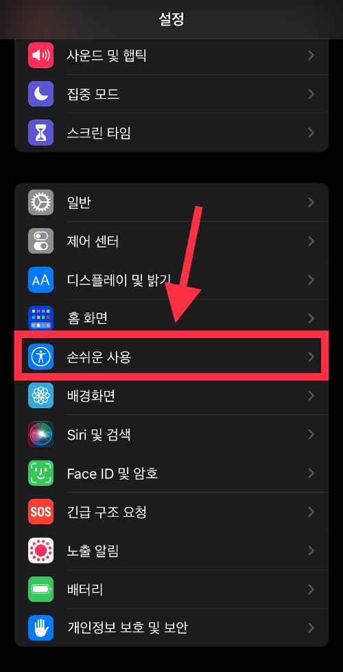 ▼ 설정 중간에 있는 [손쉬운 사용]을 누른다.