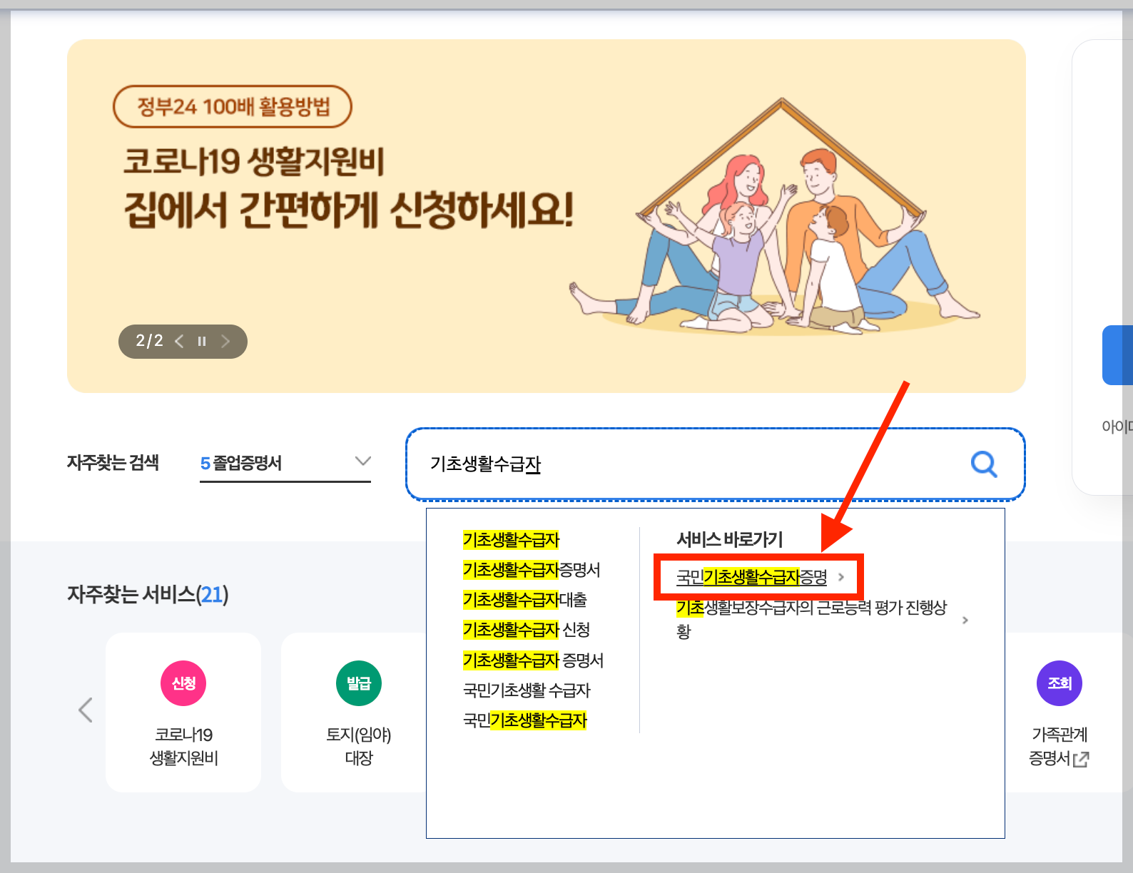 ▼ 위에 있는 링크로 들어가거나 정부24 홈페이지에서 [기초생활수급자]라고 검색한 뒤, [국민기초생활수급자증명]이라고 뜨는 메뉴를 선택합니다.