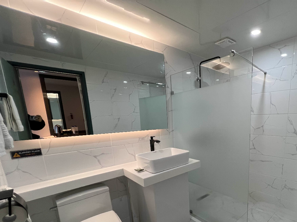 욕조는 없지만 넓었던 욕실. 샤워 부스앞에 발수건이 미리 깔려있었고, 샤워칸이 매우 넓었다.