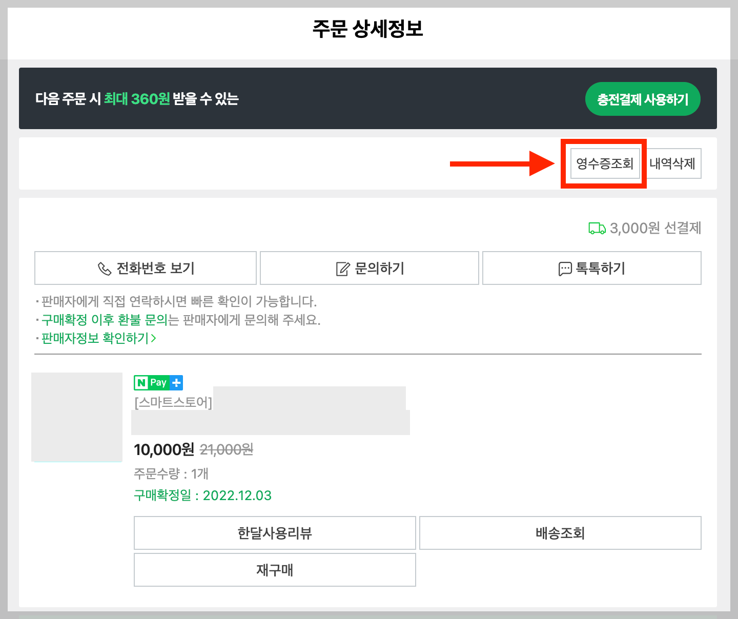 ▼ 주문 상세정보가 나오면서 오른쪽 상단에 [영수증조회] 메뉴도 나오는데, 이 메뉴를 선택한다.