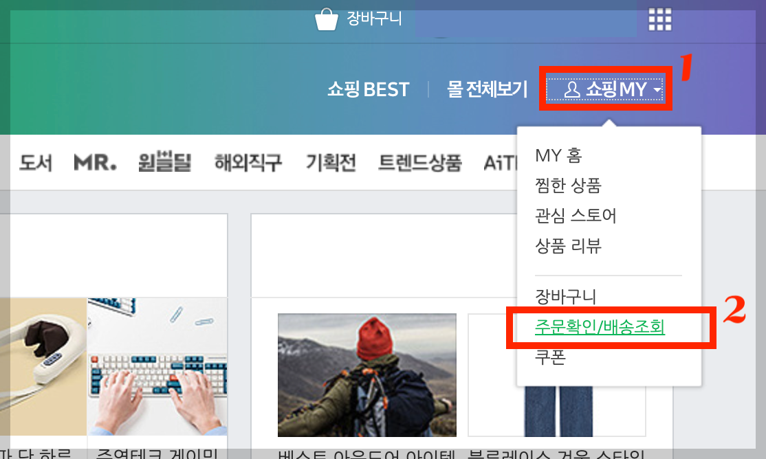 ▼ 오른쪽 상단을 보면 [쇼핑MY]가 있다. 메뉴를 선택하면 아래에 [주문확인/배송조회]가 나온다. 이 메뉴를 선택한다.