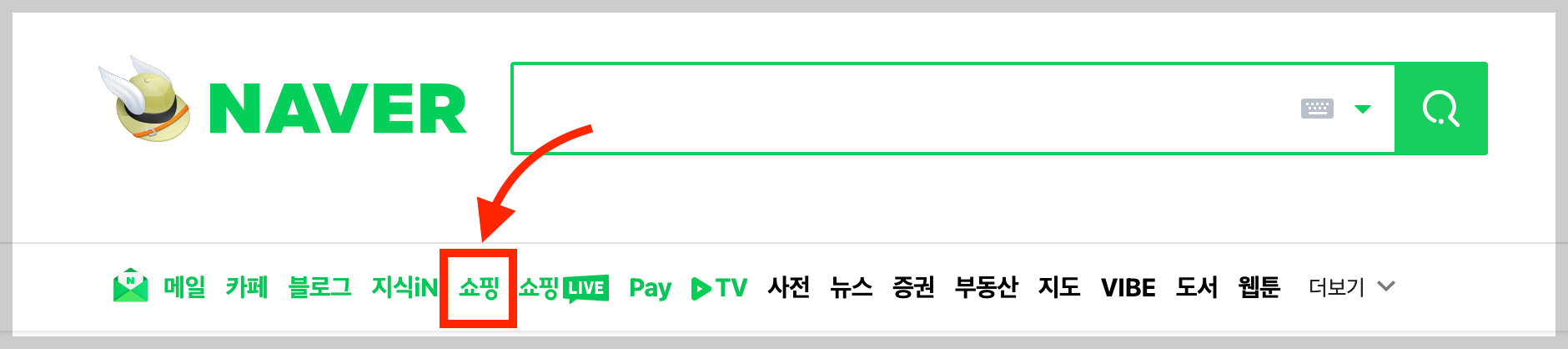 ▼ 네이버에 로그인을 한다. 그리고 상단에 있는 메뉴 중 [쇼핑]을 선택한다.