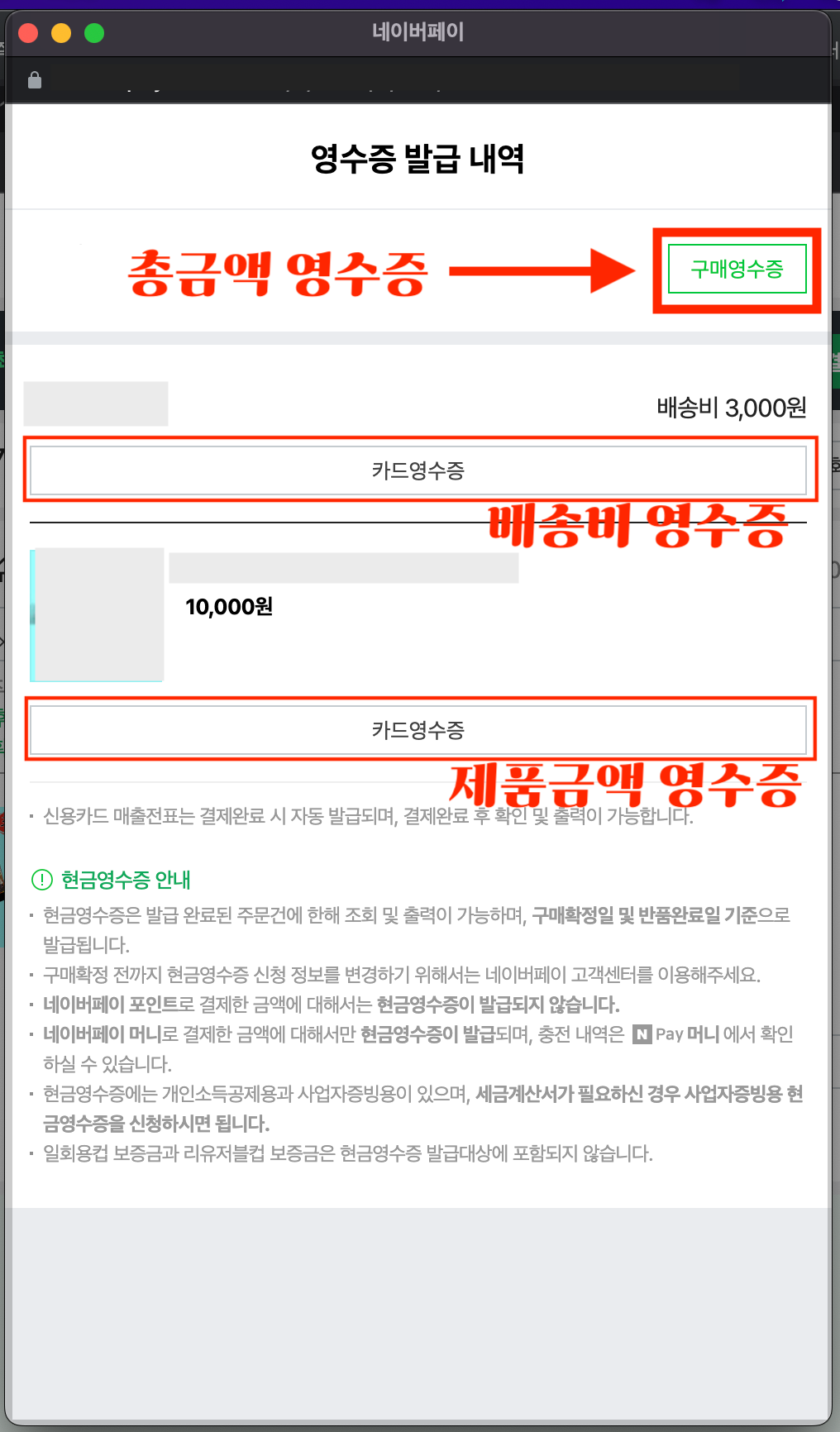▼ 아래와 같이 영수증 발급 내역이 나온다. 배송비를 결제했을 경우, 배송비 카드 영수증과 제품금액 영수증이 따로나온다. 이 총합계 영수증이 필요한 경우에는 상단의 [구매 영수증]을 누르면 된다.