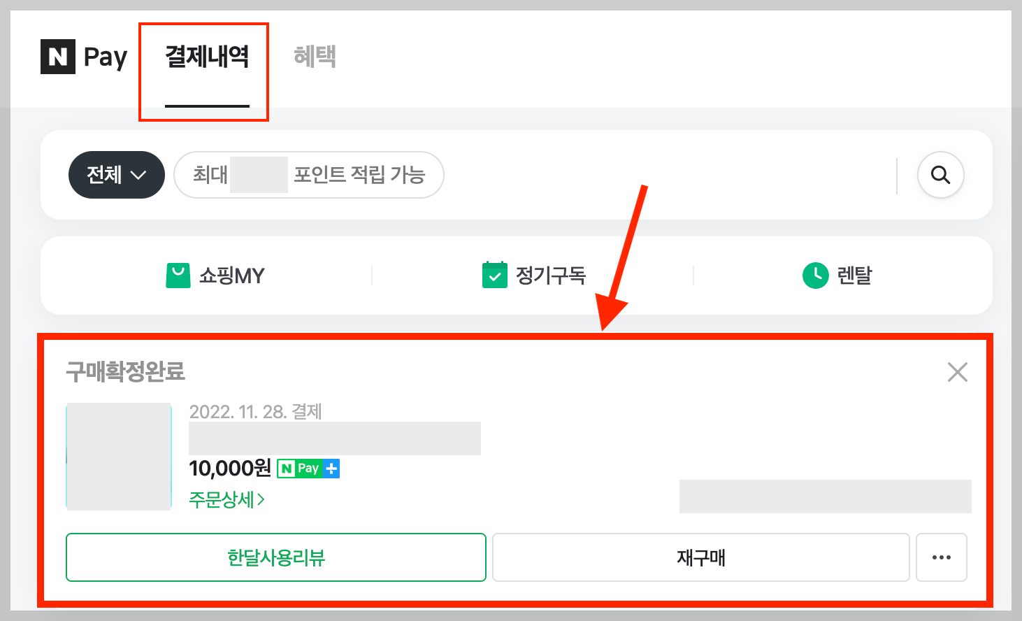 ▼ 그러면 바로 결제내역이 나오는데, 구매영수증을 출력하려는 구매내역을 선택한다.