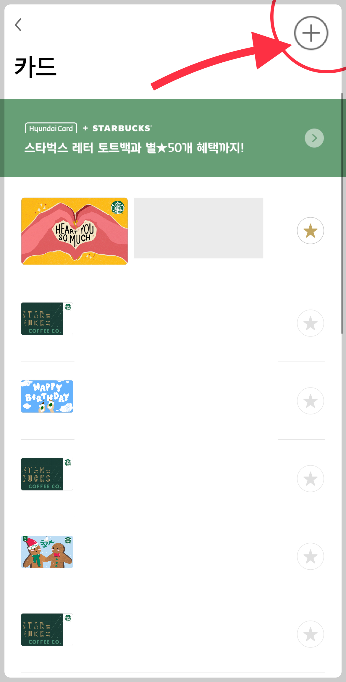 ▼ 등록된 나의 카드들을 볼 수 있는데, 여기서 또 오른쪽 상단에 있는 [ + ] 버튼을 누른다.