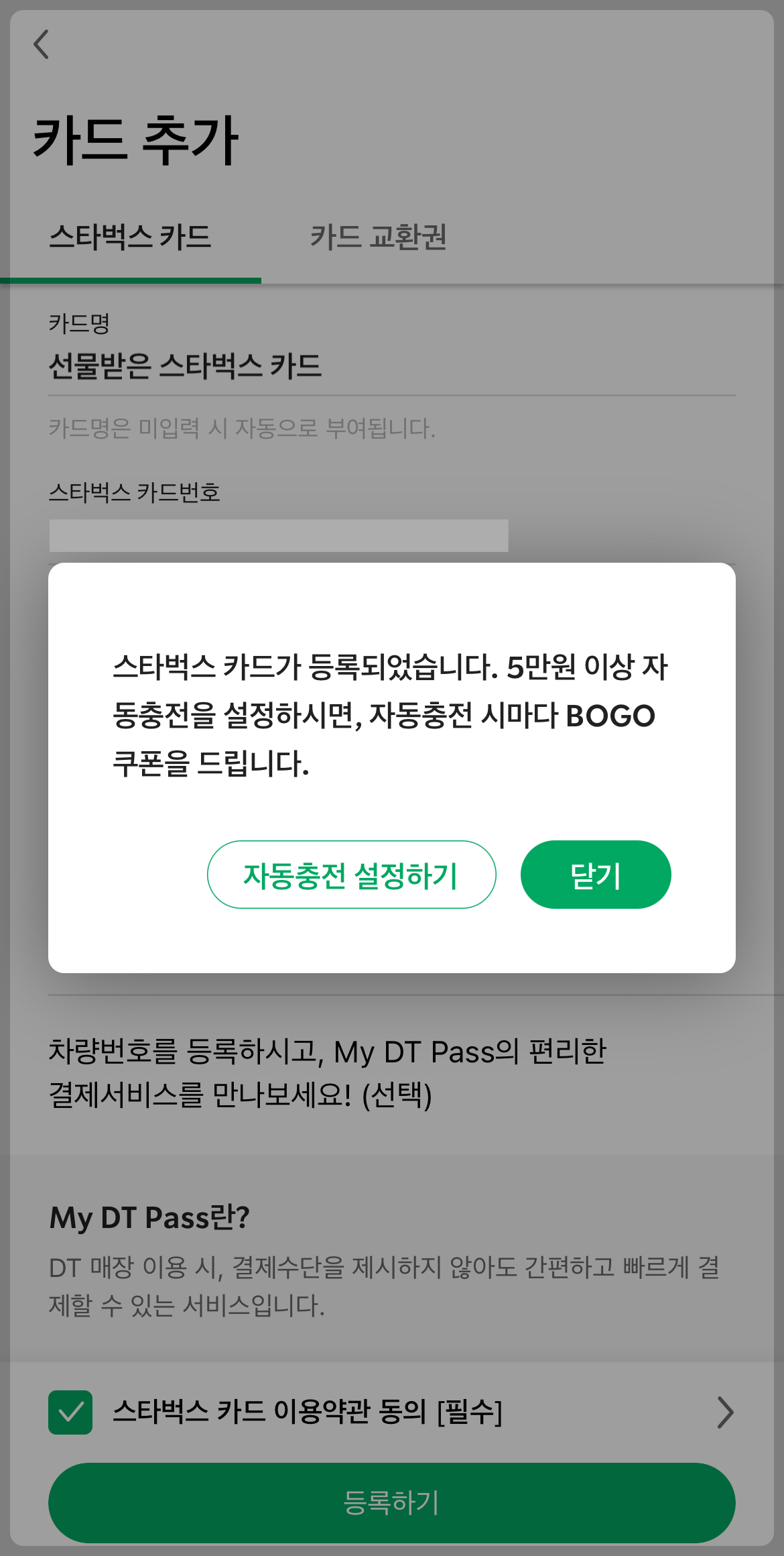 ▼ 그러면 아래와 같이 스타벅스 카드가 등록되었다는 메세지가 나온다.