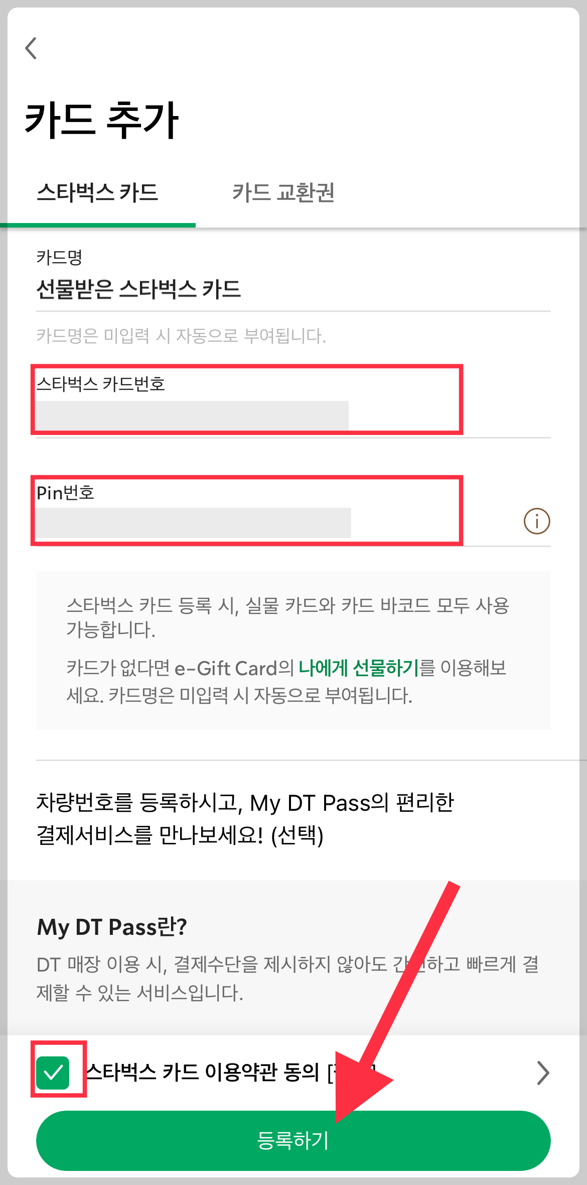 ▼ 그리고 위에서 확인한 카드 정보를 입력한다. 약관에 동의 한 뒤 [등록하기] 버튼을 누른다.