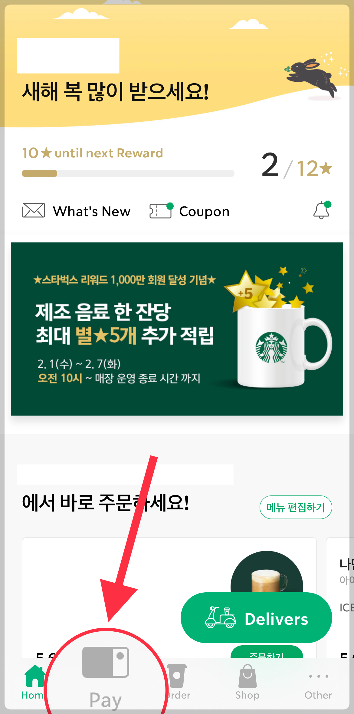 ▼ 스타벅스 어플을 켜면 아래와 같은 화면이 나오는데, 하단 메뉴중에 왼쪽에서 두번째에 있는 [Pay] 메뉴를 선택한다.