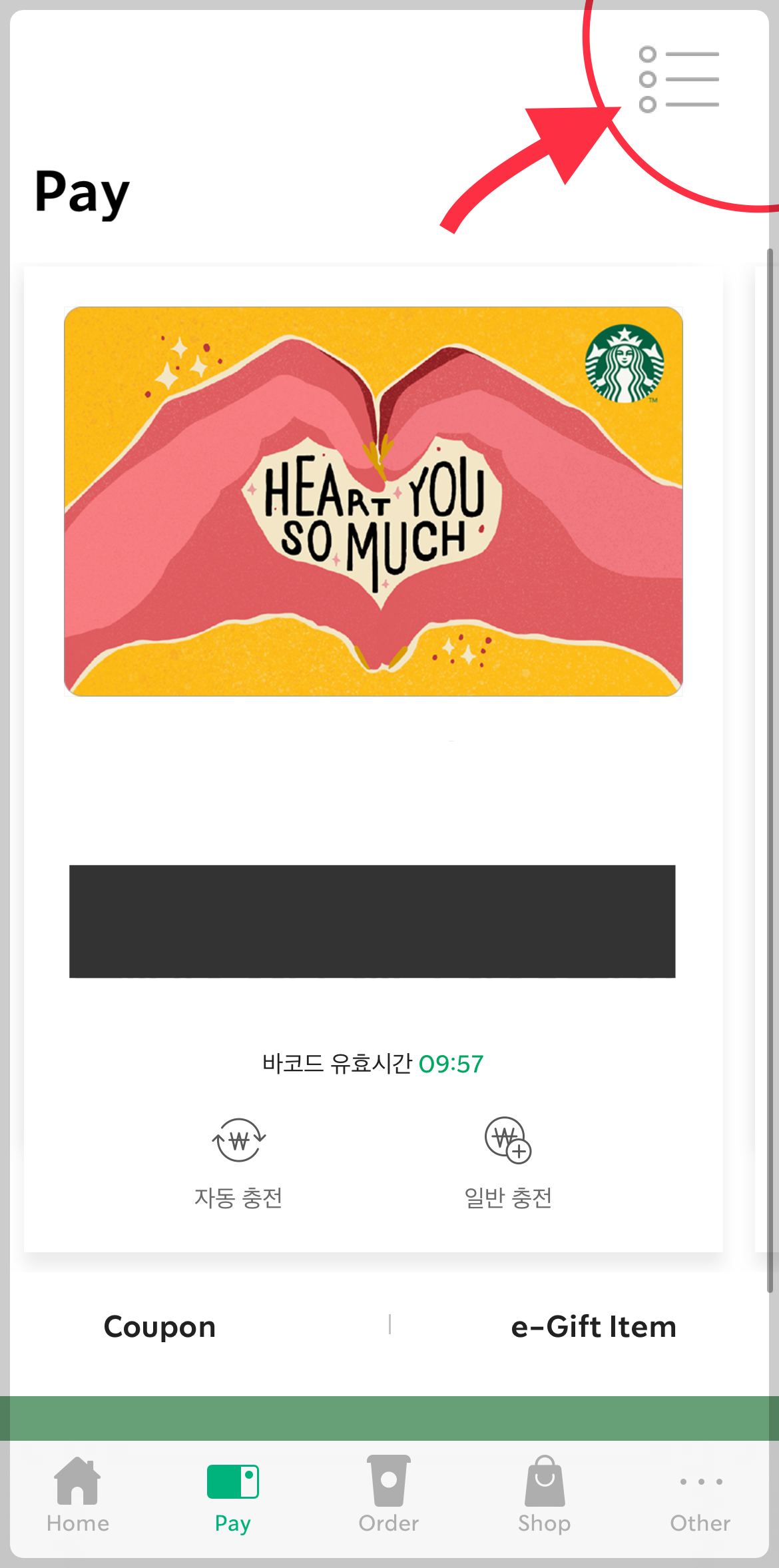 ▼ 사용하고 있는 스타벅스 카드 바코드가 나온다. 여기서 우측 상단에 있는 줄 세개 메뉴를 선택한다.