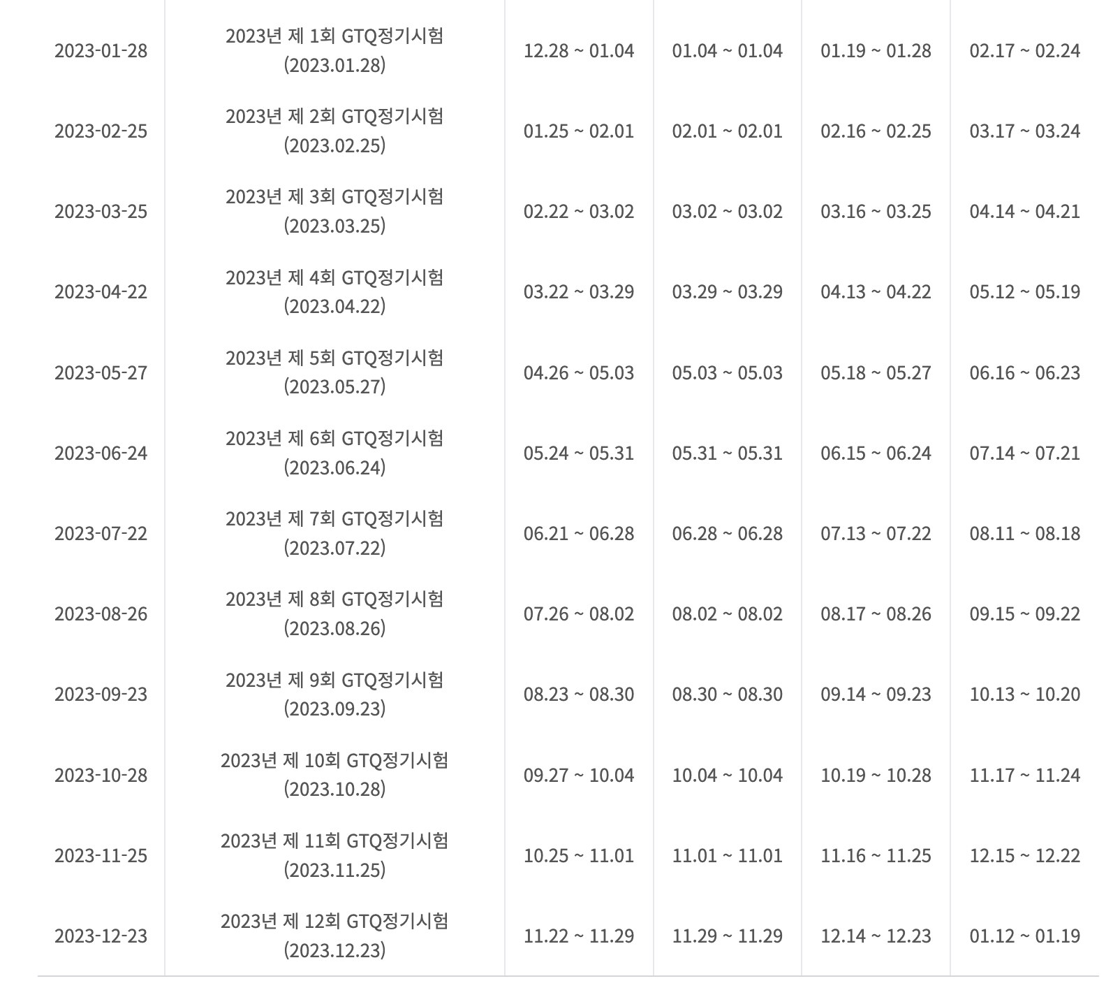 2023년 GTQ 그래픽기술자격 시험은 1년에 총 12회 이루어지는데요. 한달에 한 번, 셋째주 토요일에 시험이 있습니다.