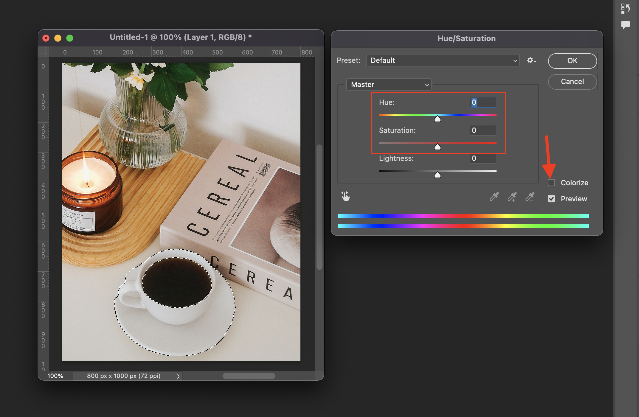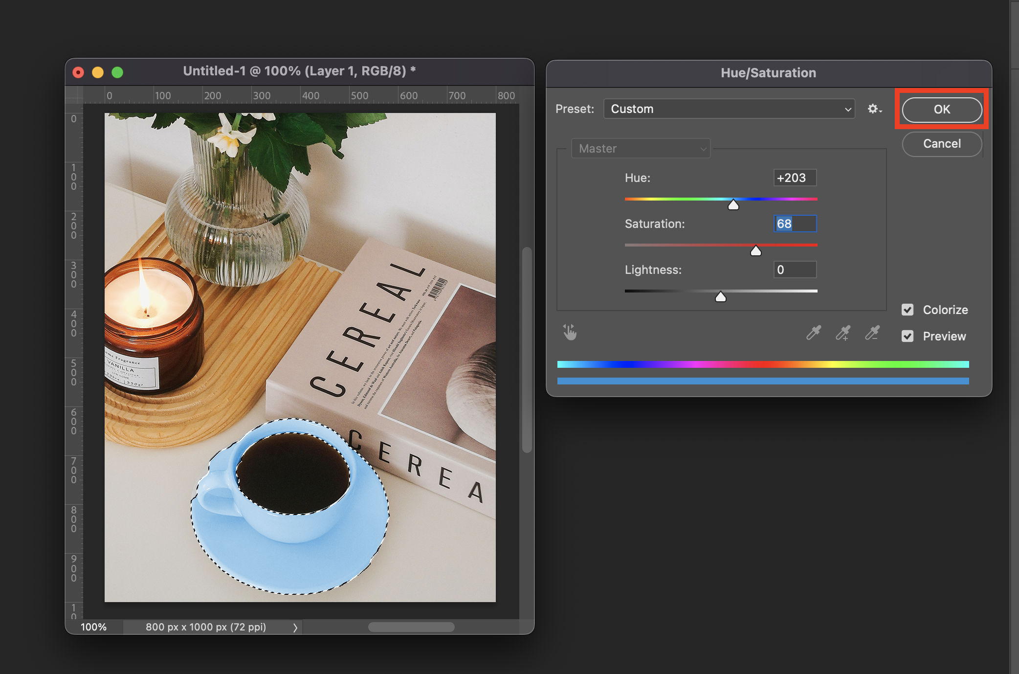 ▼ 그리고 Hue/Saturation 메뉴에서 Hue 와 Saturation 의 수치를 조절하면서 색을 맞추어 준다. 전체적인 색상을 변경 하기 위해서는 [Colorize] 에 체크를 해준다. (종종 Lightness 를 사용하기도 한다.)