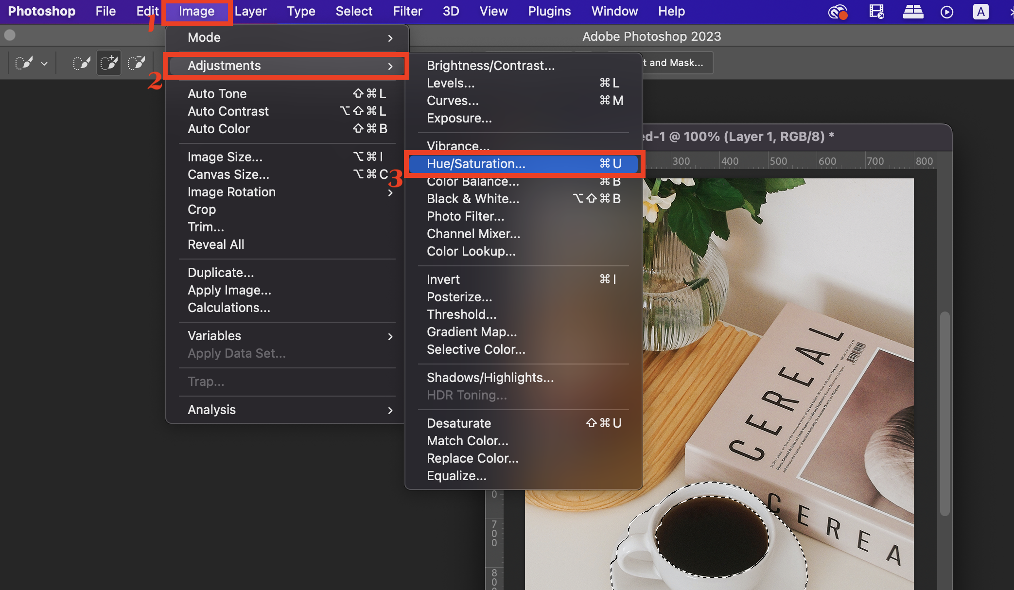 ▼ 선택이 완료 된 뒤에는 이미지 색상을 변경해주어야 한다. 상단 메뉴에서 [Image] - [Adjustments] - [Hue/Saturation] 을 선택한다.
