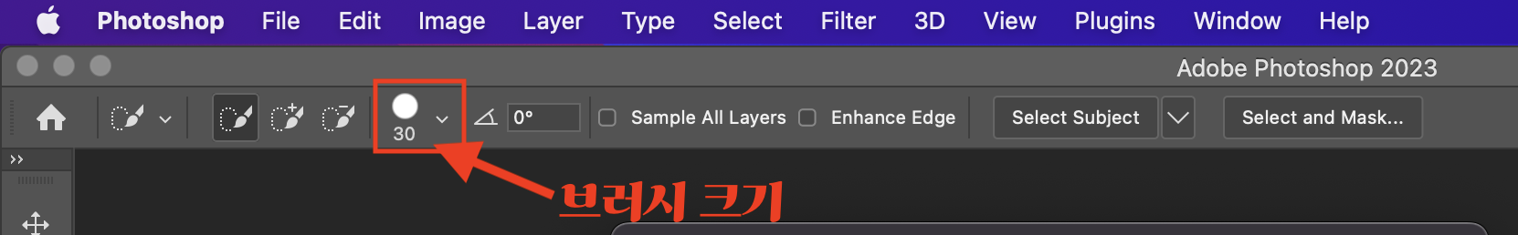 ▼ 퀵 셀렉션툴을 선택하면 포토샵 위쪽에 아래와 같이 옵션창이 나온다. 이 곳에서 퀵 셀렉션 툴의 브러시 크기를 설정할 수 있다.