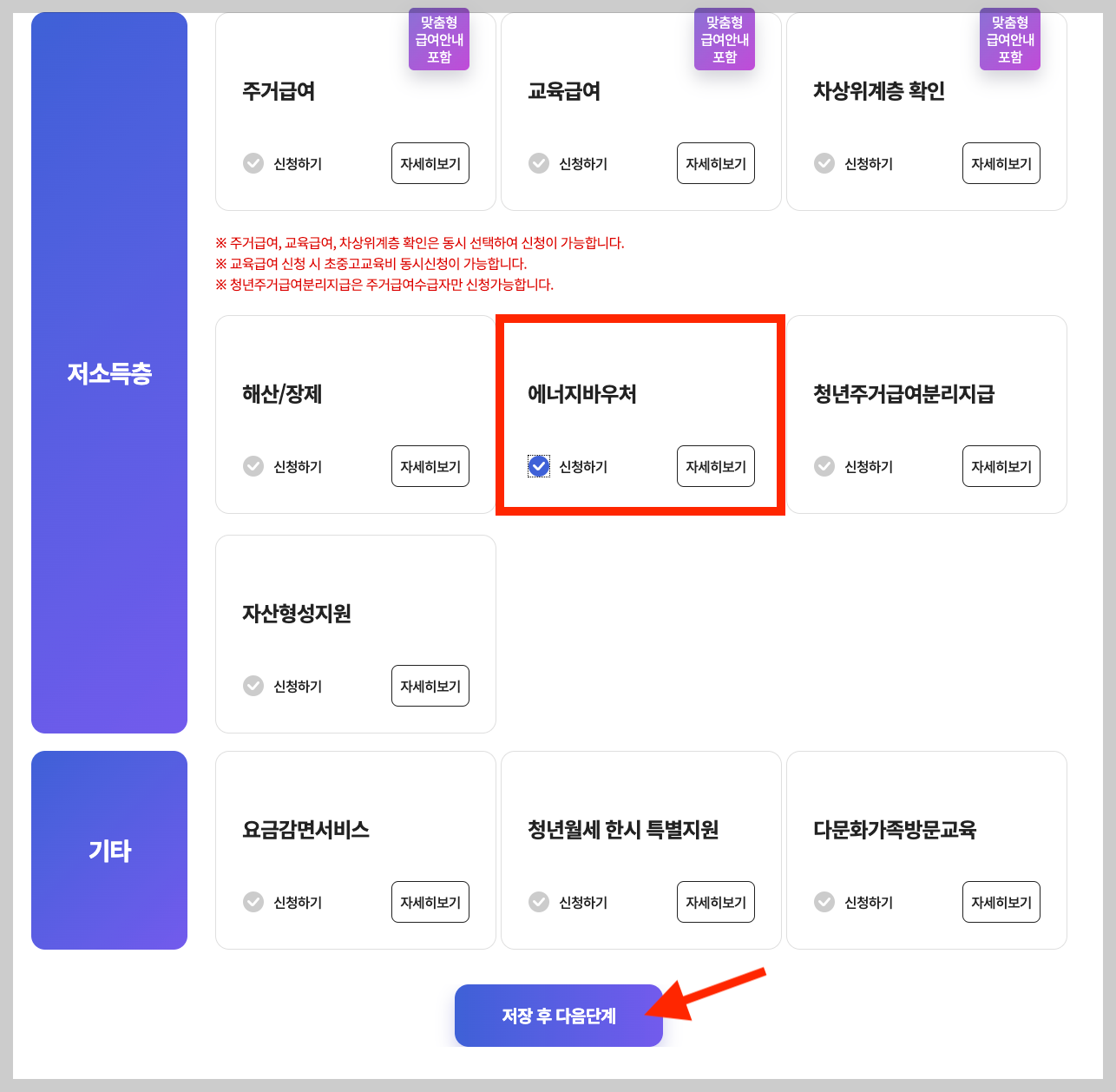 ▼ 신청항목 중에 [저소득층] - [에너지바우처] 신청하기에 체크를 한 뒤 [저장 후 다음단계] 를 누른다.