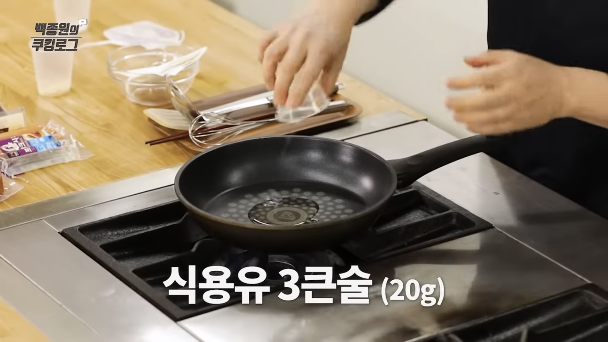 식용유 3큰술을 후라이펜에 둘러줘요.