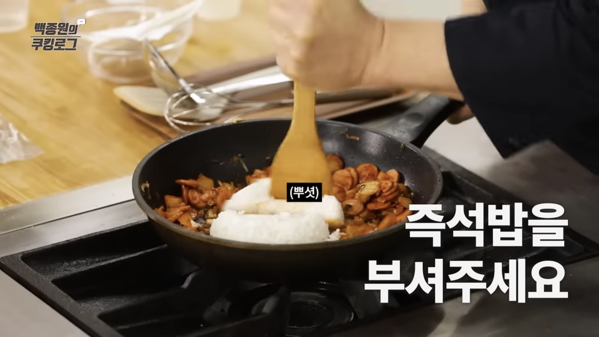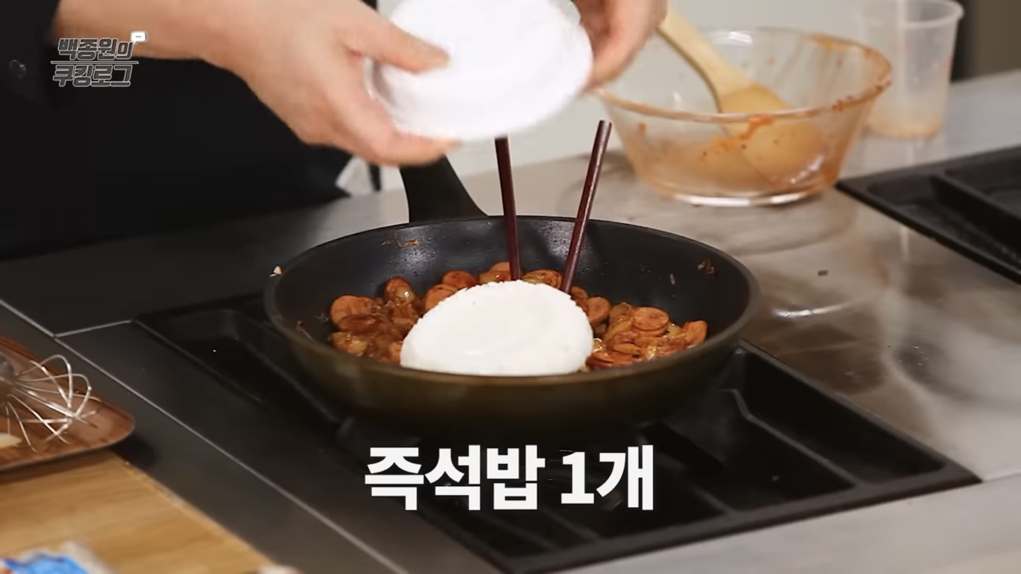 김치가 어느정도 익고나면 가스불을 꺼준 뒤, 밥을 넣어줍니다. 백선생님은 즉석밥 한개를 넣으셨어요. 저는 집에 오래된 찬밥이 남아있어서 넣어주었어요.
