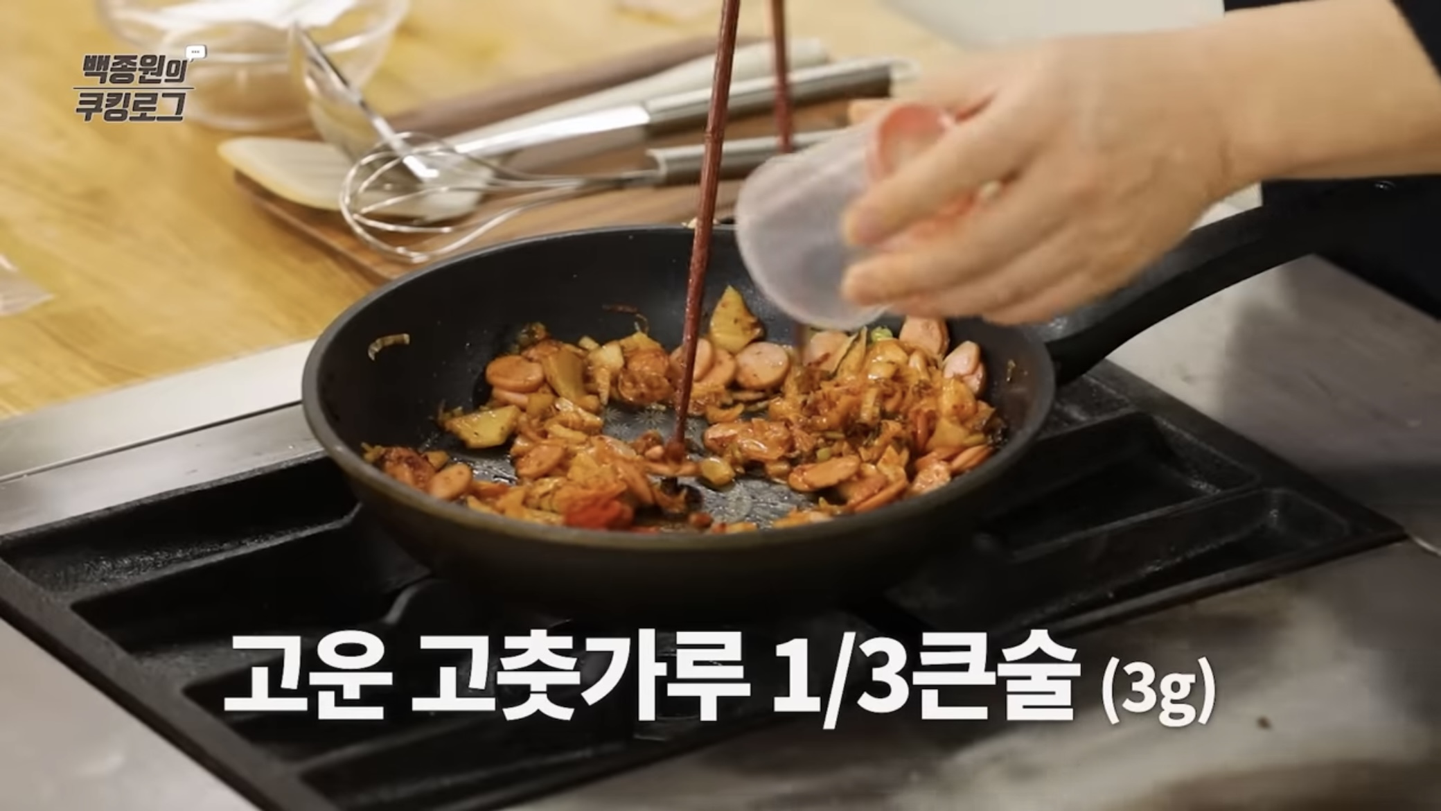 고춧가루를 1/3 큰술 넣어줍니다. (저는 김치에 고춧가루가 많아서 생략했어요.)