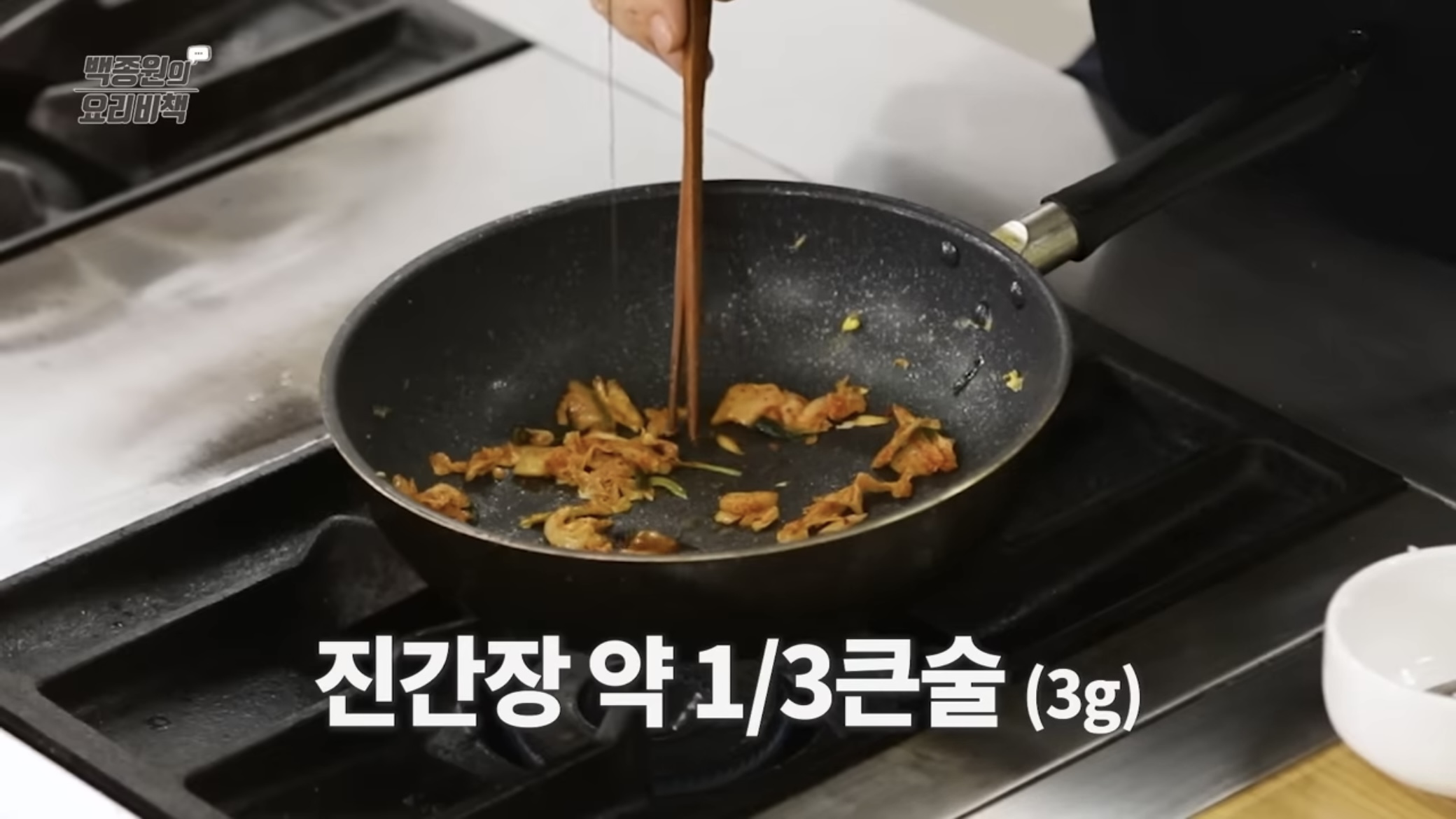 김치가 어느정도 볶아지면 진간장 1/3 큰술을 넣고 볶는다.