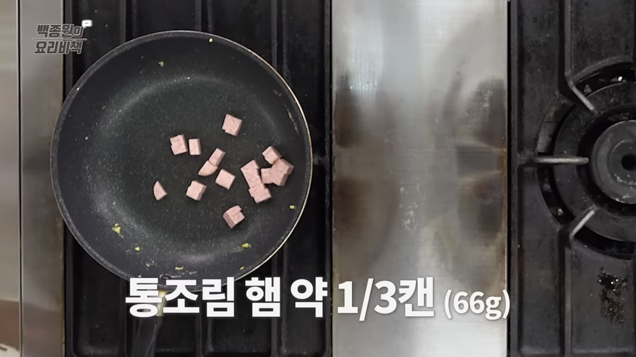 햄과 식용유를 넣고 볶는다. 나는 3인분을 만들었는데 1캔 전부 넣으니 딱 맞았다,