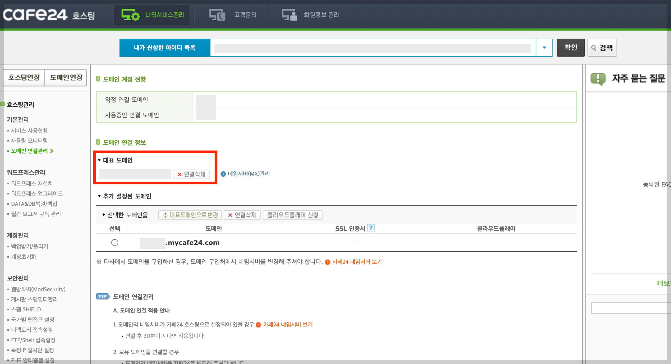 ▼ 왼쪽에 있는 메뉴에서 [호스팅관리] - [기본관리] - [도메인 연결관리] 로 들어간다. 아래와 같이 대표 도메인이 카페24에서 제공해준 기본 도메인이 대표로 되어있다.