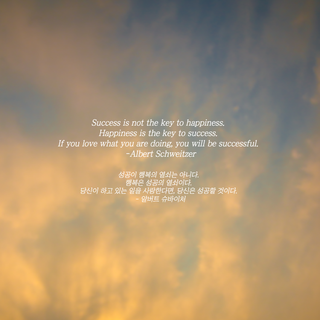 성공이 행복의 열쇠는 아니다. 행복은 성공의 열쇠이다. 당신이 하고 있는 일을 사랑한다면, 당신은 성공할 것이다. - 알버트 슈바이처