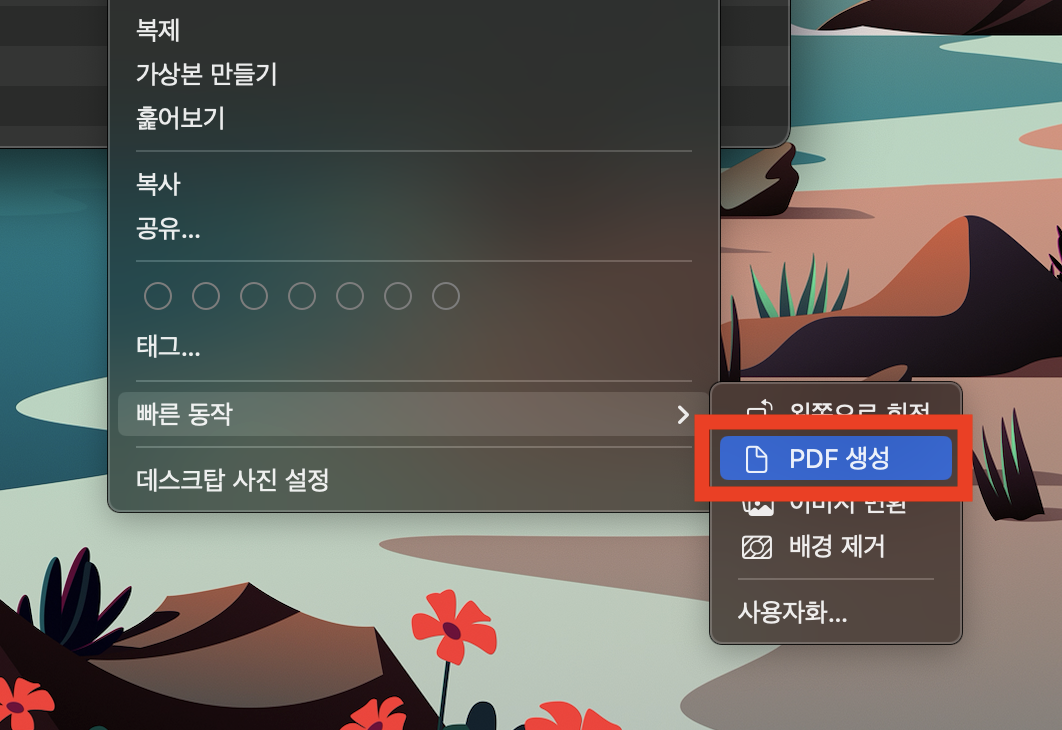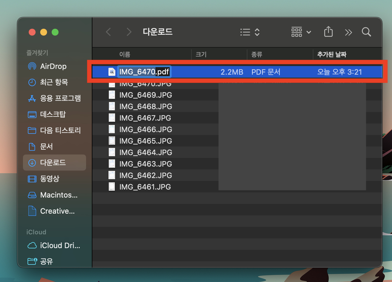 서류 사진을 찍은 뒤에, PDF 로 모아서 하나의 파일로 만들어 첨부해야 할 때가 있다. 이럴 때 맥북에서 간단하게 사진을 PDF 파일로 변환할 수 있다.