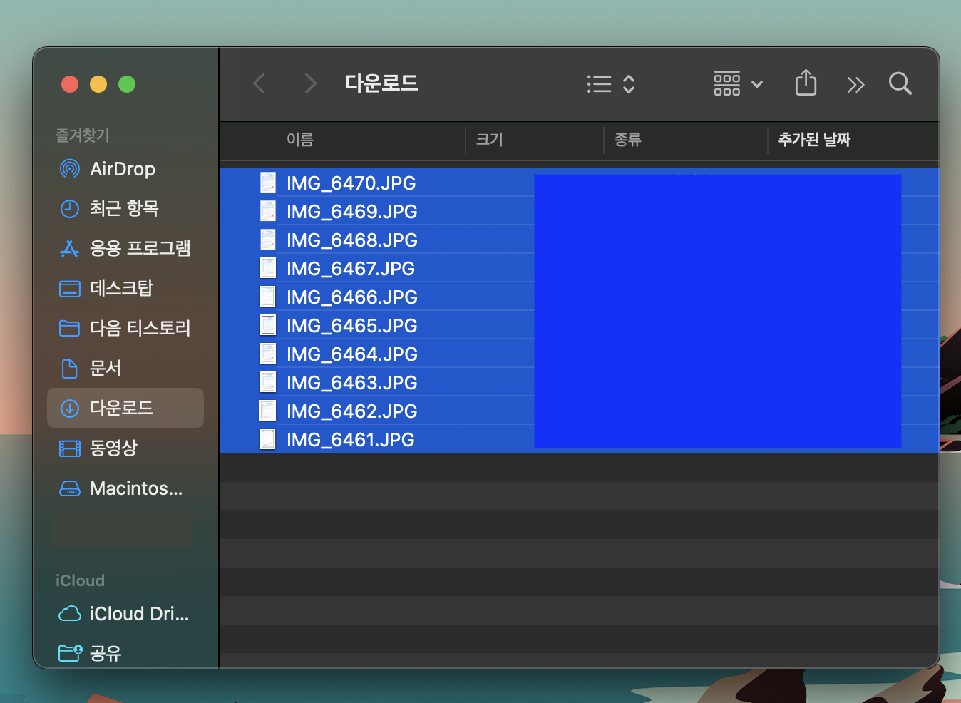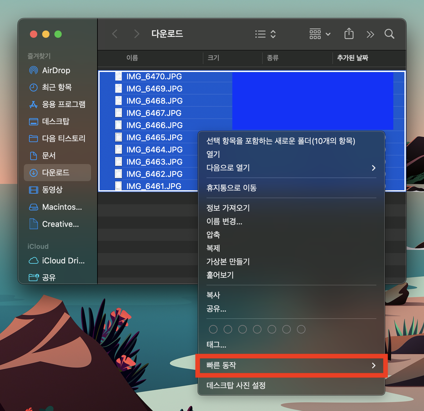 ▼ 먼저 에어드롭을 이용해서 아이폰의 사진을 맥북으로 옮겨준다. 그리고 드래그 해 준 뒤, [두 손가락 클릭] 즉 우클릭을 해준다. (한장만 PDF로 바꿀때에는 한장만 선택 후 우클릭)