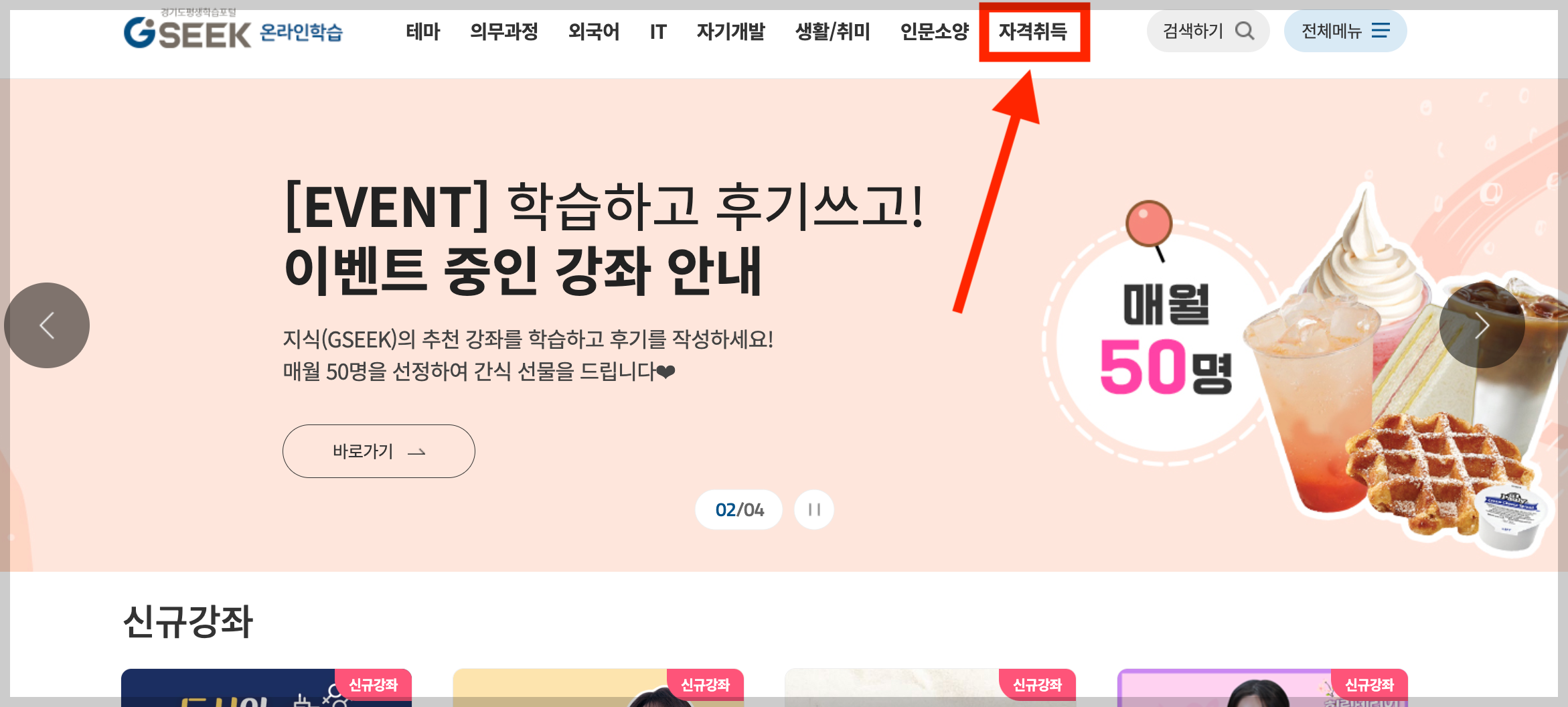 ▼ 경기도평생학습포털GSEEK 사이트에 접속 후 [온라인 학습] 을 선택한다.