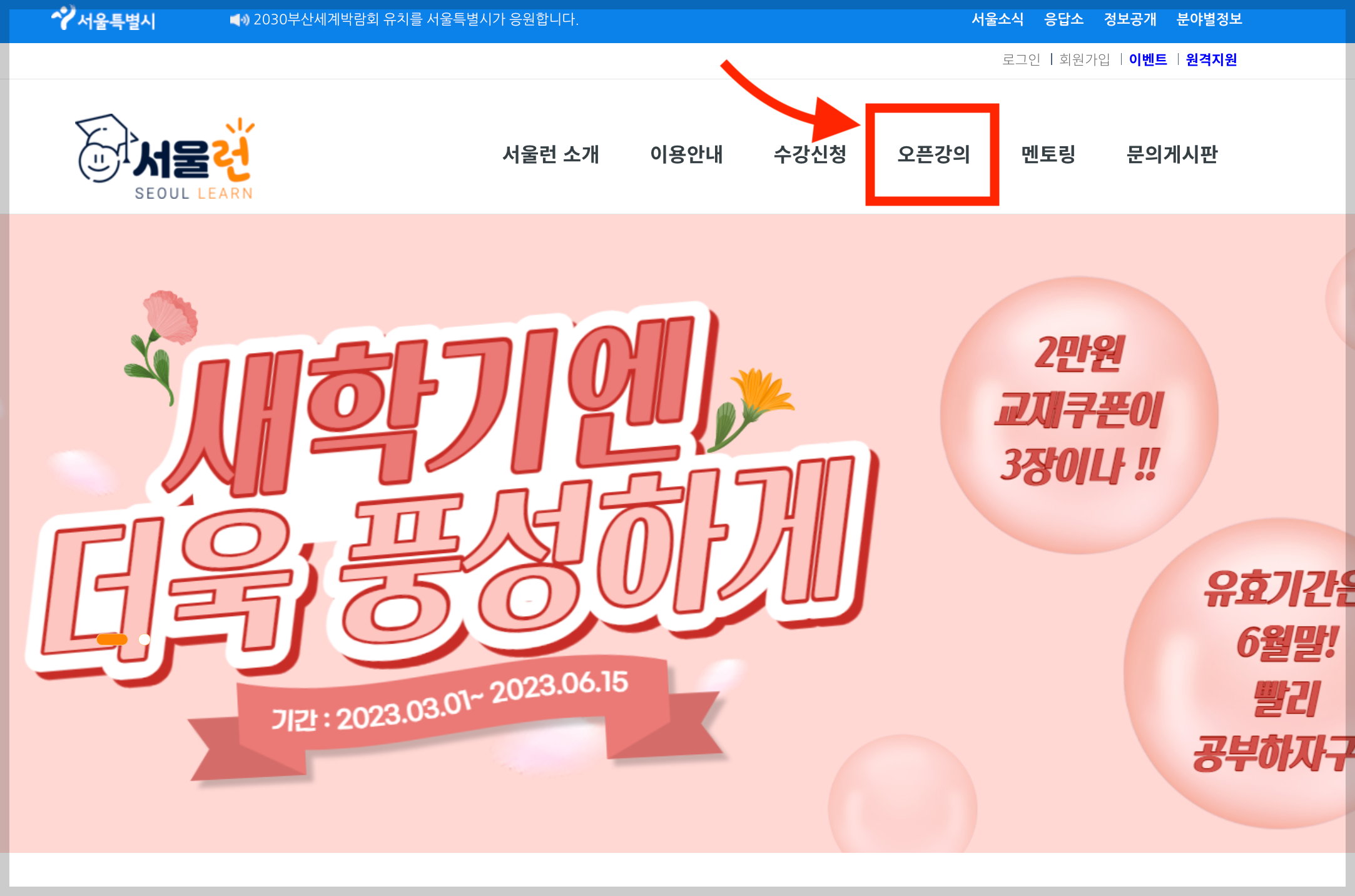▼ 서울런 홈페이지에 접속한 뒤, 상단 메뉴에 있는 [오픈강의]를 선택한다.