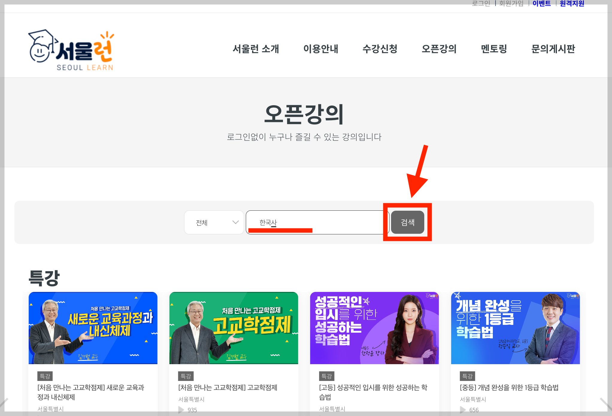 ▼ 강좌를 듣기 위해서는 검색을 해야한다. '한국사' 라고 검색창에 입력한 뒤 [검색]을 누른다.