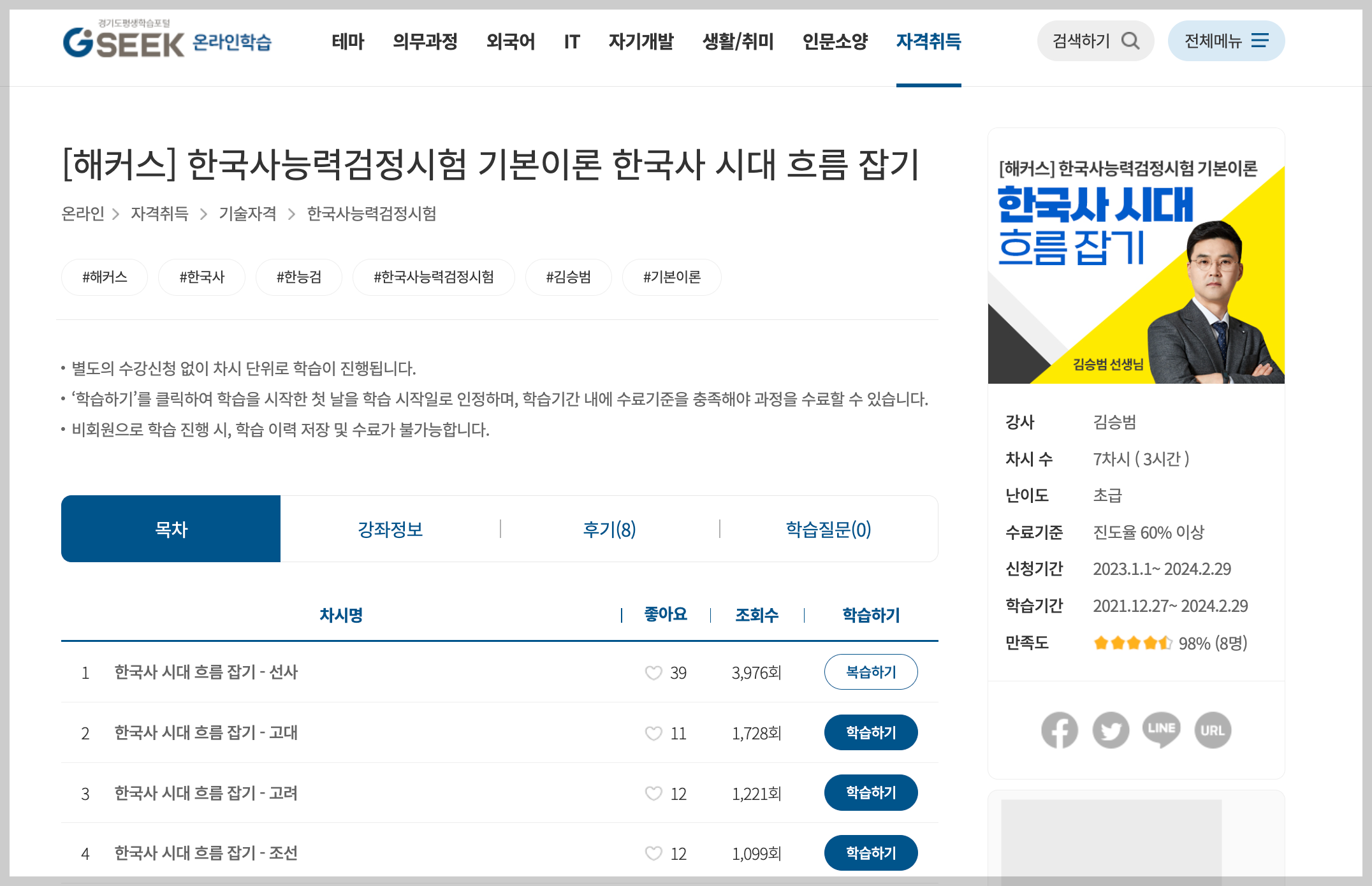 ▼ 아래와 같이 한국사능력검정시험에 관련 된 6개의 강의를 무료로 들을 수 있다.