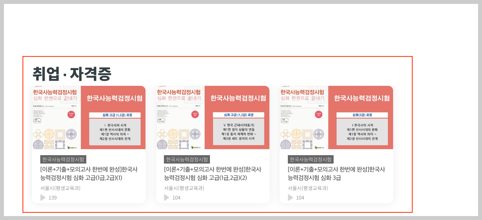 ▼ 취업 및 자격증 부분으로 내려 가면 한국사능력검정시험 3개의 강좌가 나온다.