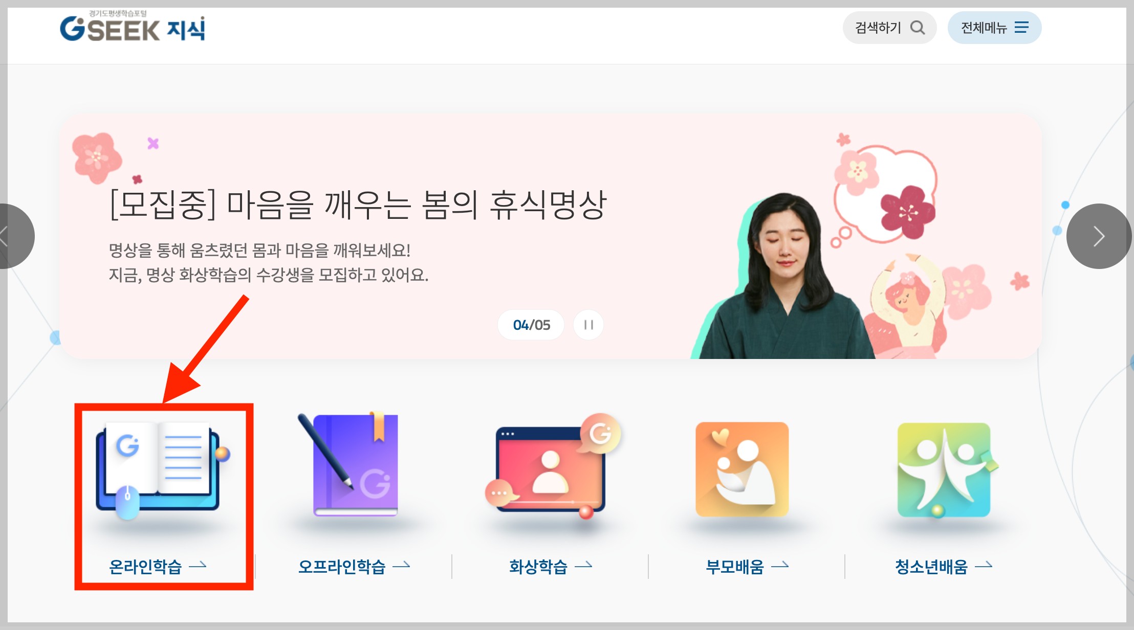 ▼ 경기도평생학습포털GSEEK 사이트에 접속 후 [온라인 학습] 을 선택한다.