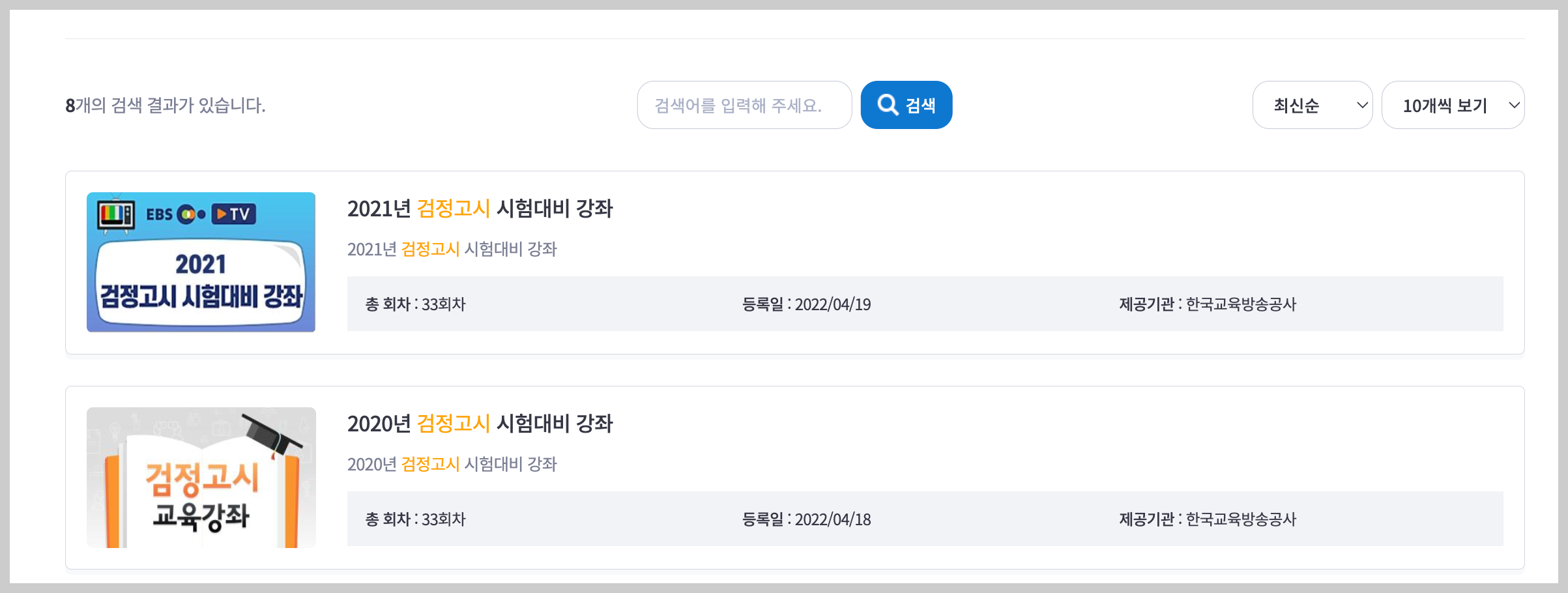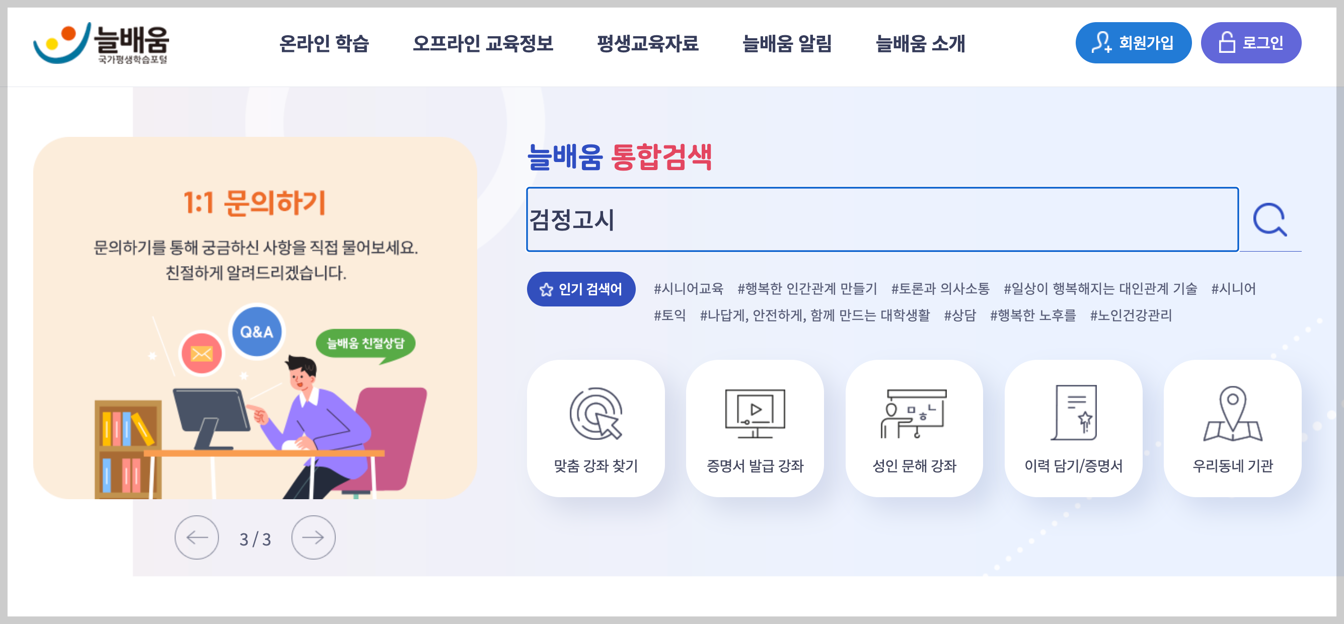 늘배움 홈페이지에 접속한 뒤 검색창에 [검정고시]를 입력하면 강좌가 나옵니다.
