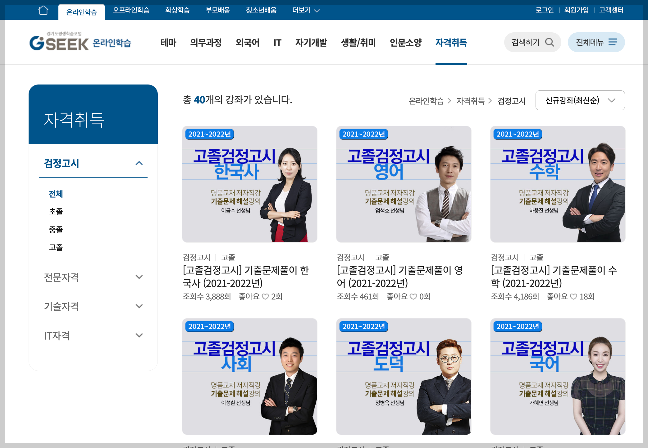 경기도에서 운영하는 평생학습포털 사이트 입니다. 검정고시 강의를 초졸, 중졸, 고졸 모두 들을 수 있게 되어있습니다. 검정고시 뿐만 아니라 다양한 외국어, 자격증 관련 강좌들도 많이 있습니다.