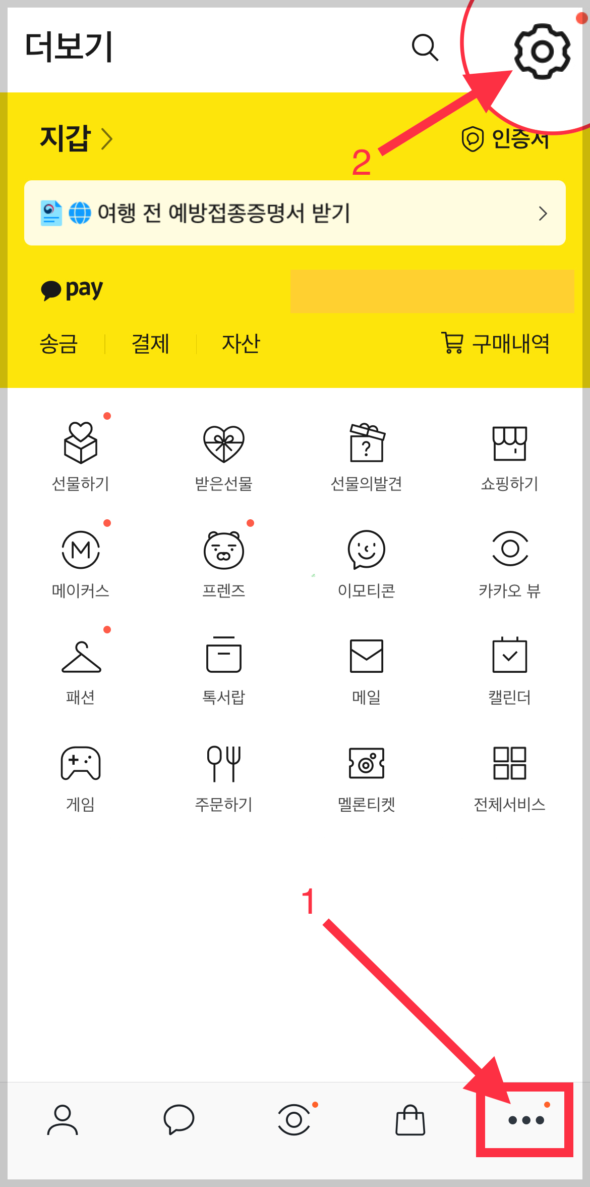 ▼ 카카오톡 하단의 점 세개 [· · ·] 메뉴를 선택한 뒤, 오른쪽 상단에 있는 [톱니바퀴] 메뉴를 선택한다.