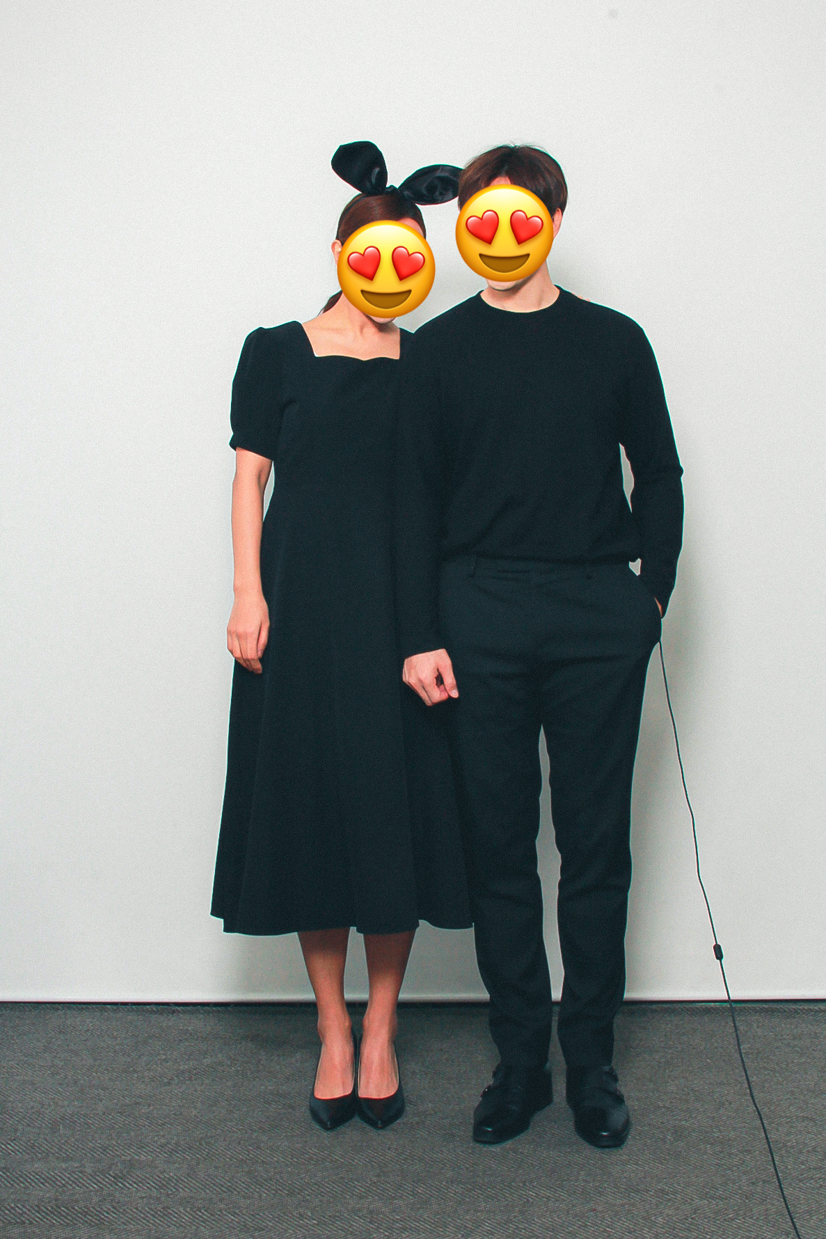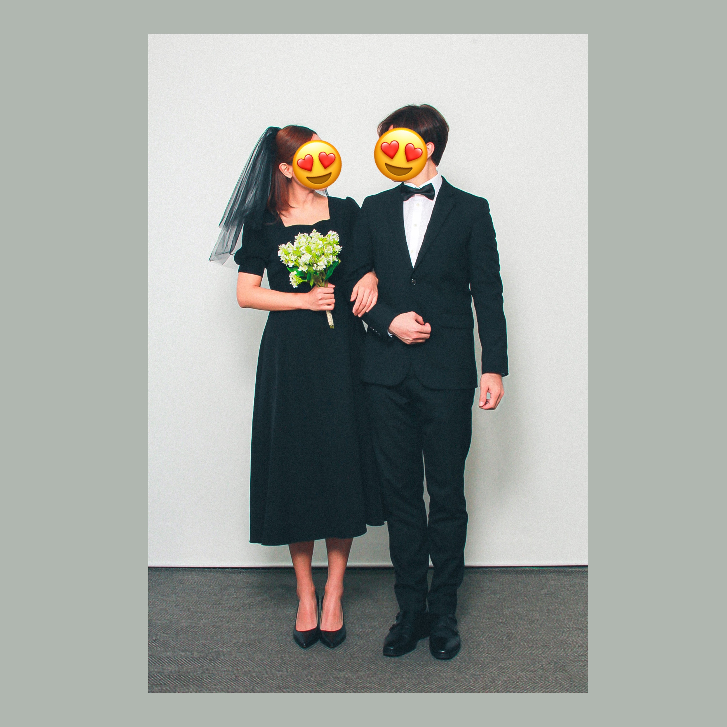 1. 신부 블랙 원피스(검은색 베일, 검은 구두 챙기기) + 신랑 블랙 정장 (검은 티, 흰 티, 검은색 보타이, 검은색 구두 챙기기)