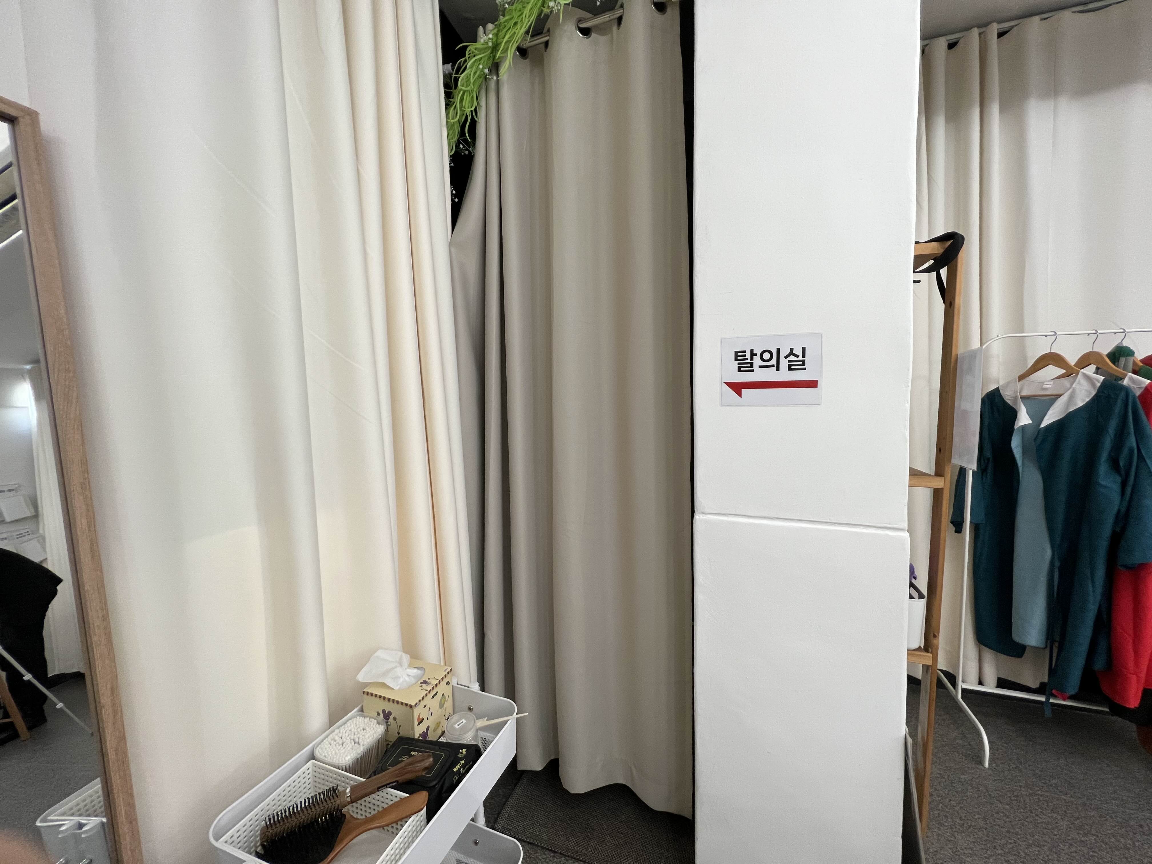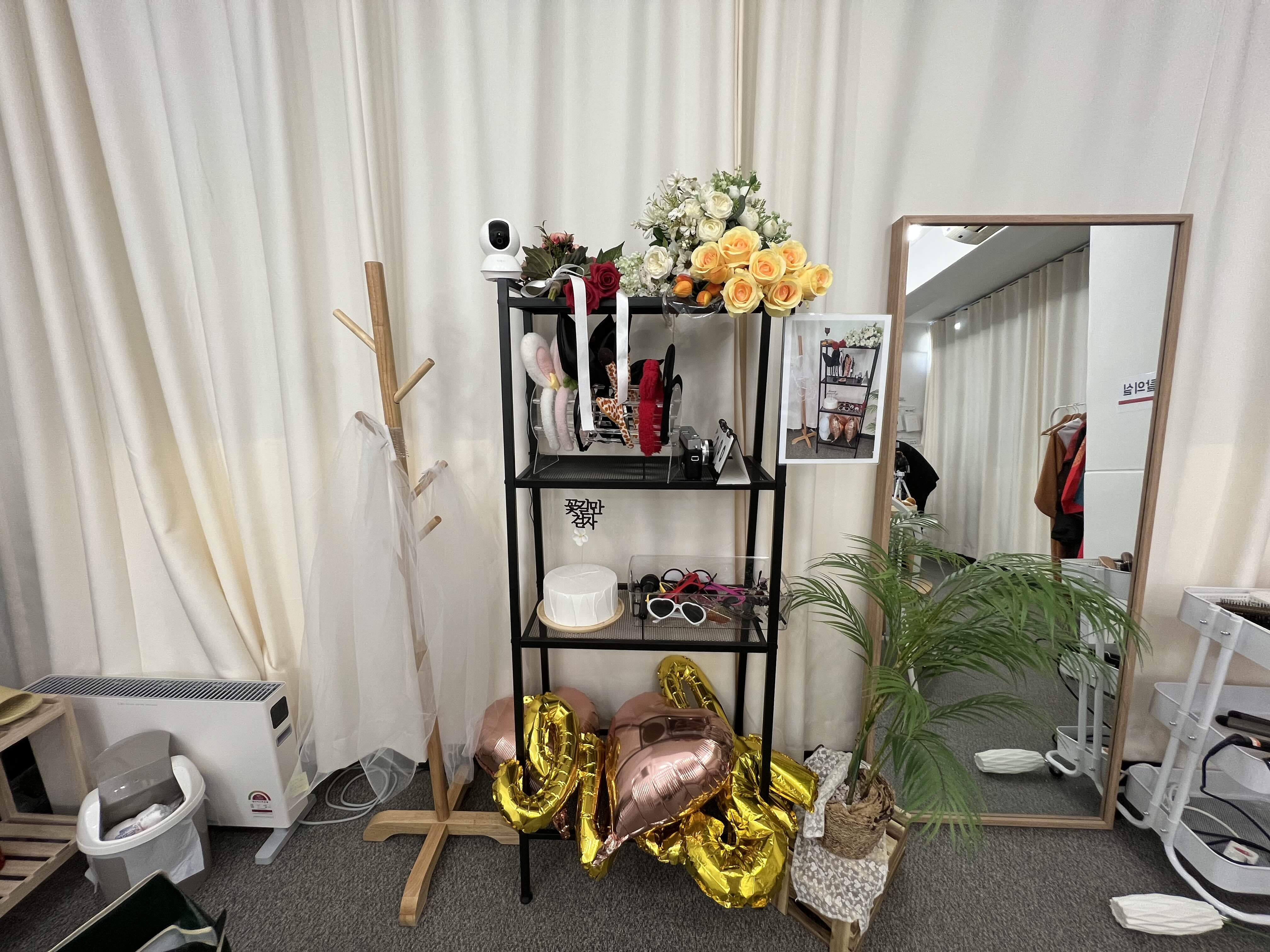 요즘 대부분의 셀프사진관이 그렇듯, 이곳에도 탈의실과 각종 소품이 구비되어 있어서 편했다. 그리고 셀프사진관은 우리 둘 밖에 없기 때문에 사진 찍을 때 부끄러움이 적었던 것 같다.