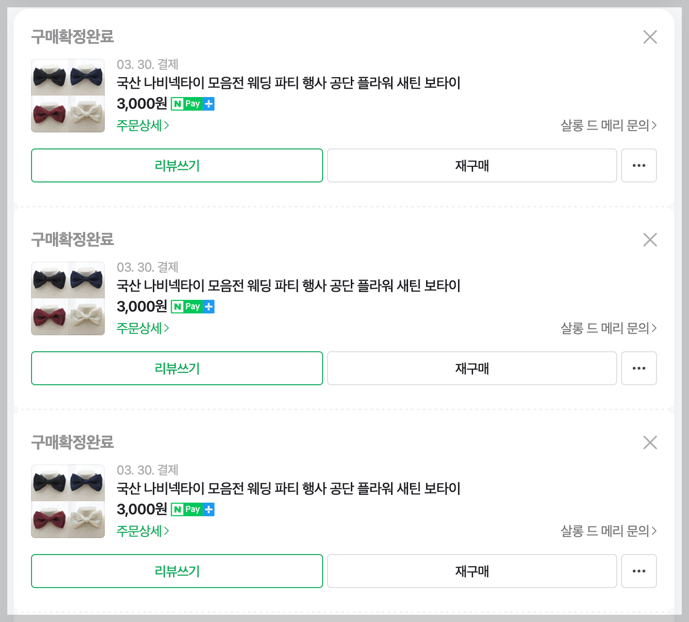 보타이는 3개 총 9,000원이었고, 신부 베일과 함께 주문했기 때문에 배송비는 따로 들지 않았다.
